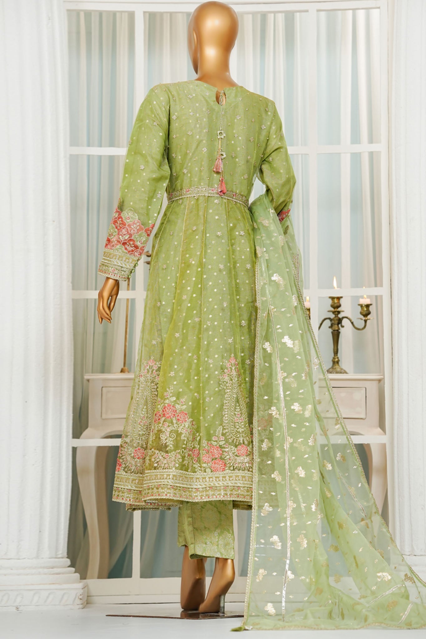 - Badla Boti Organza Dupatta with Highlights of Stitching Details & Hanging.