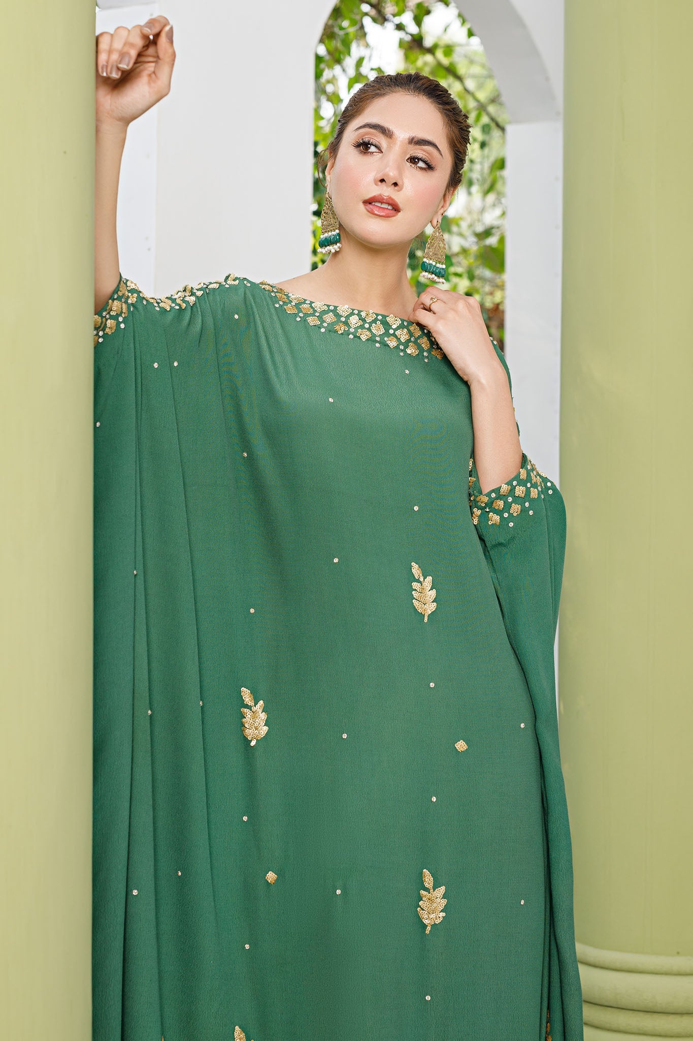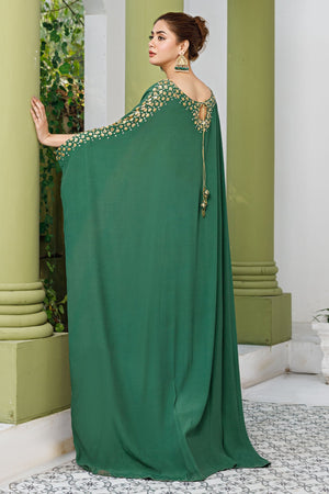You can never go wrong with this absolutely gorgeous combination of green and gold in a stunning fusion kaftan. Beautifully handworked all over with handmade tassels at the back.