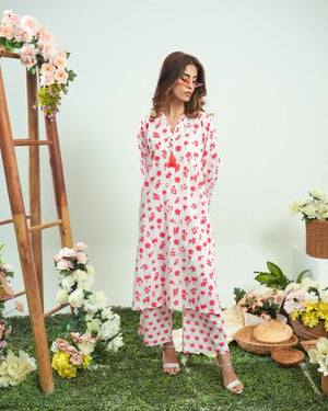 Step up your wardrobe with our exquisite printed Matching separates. This stunning 2-pc enhances intricate button detailing on the neckline of the shirt with convenient side pockets, and perfectly paired trousers.