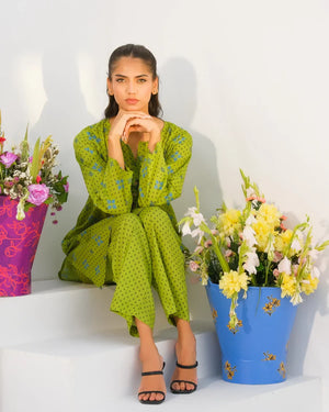 Step up your wardrobe with our exquisite printed Matching separates. This stunning 2-pc enhances intricate button detailing on the neckline of the shirt with convenient side pockets, and perfectly paired trousers.