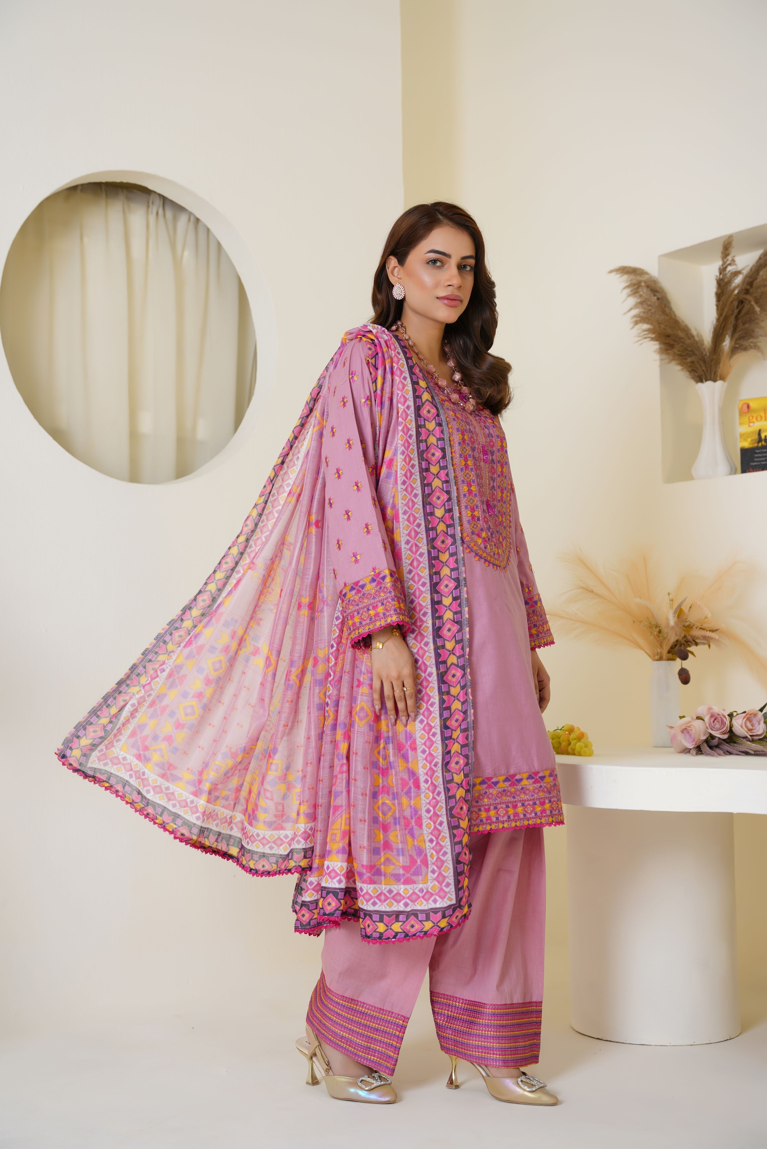 Threads & Weaves Mauve Pink Embroidered Viscose 3-Piece Suit