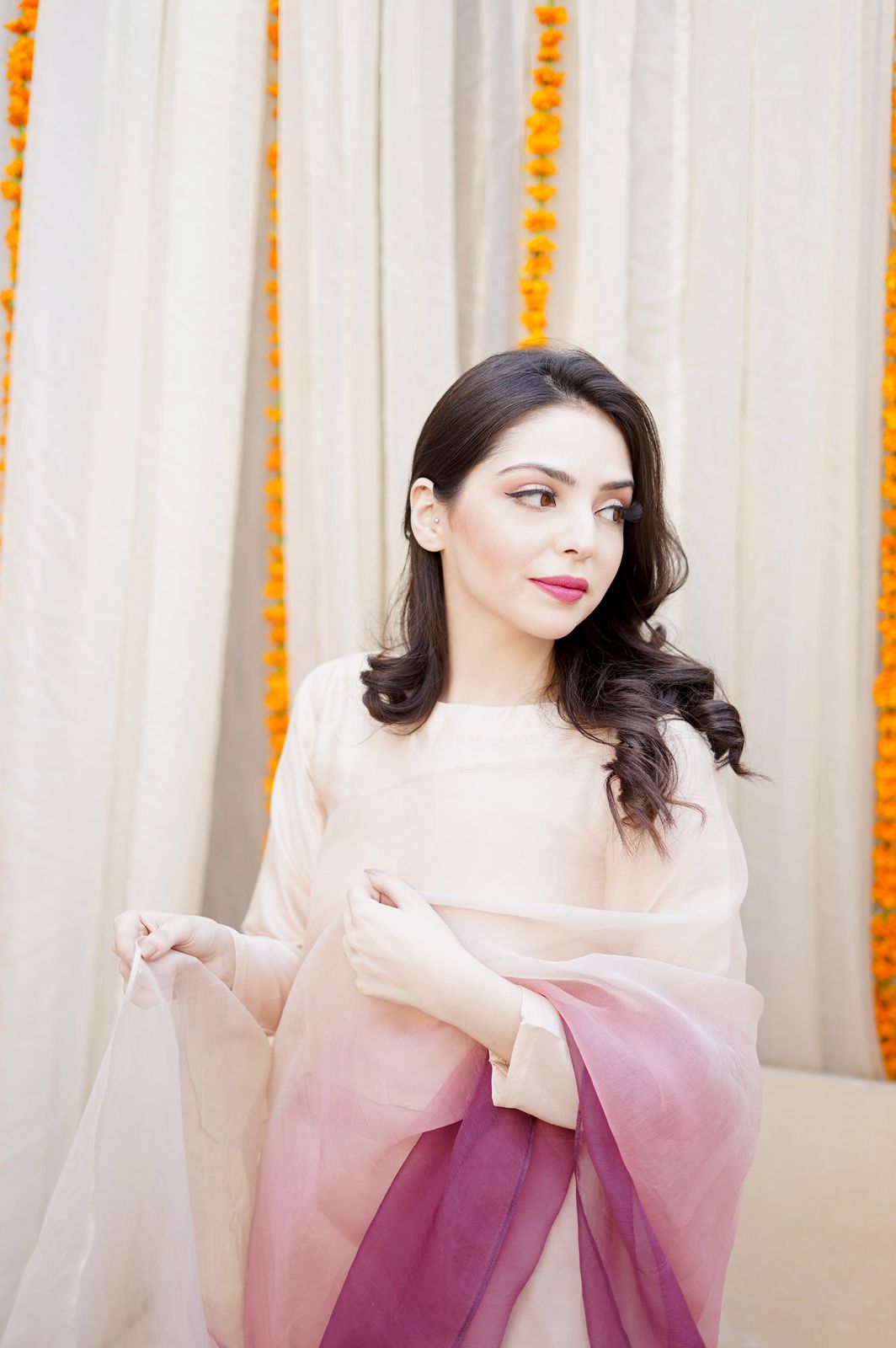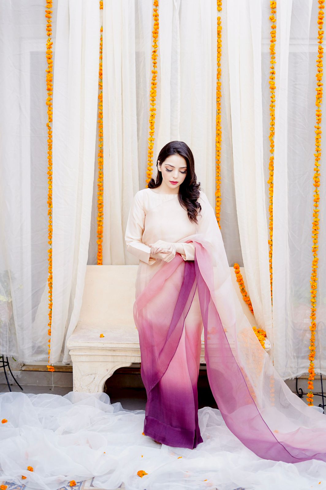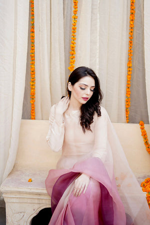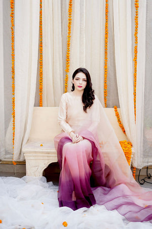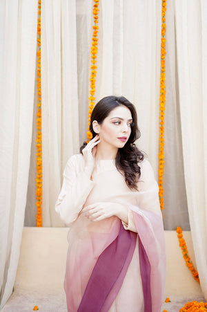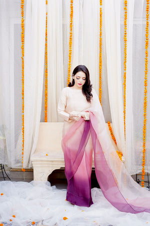 Tea pink to Plum Ombre Sarhi With Full fitted Sleeves Blouse