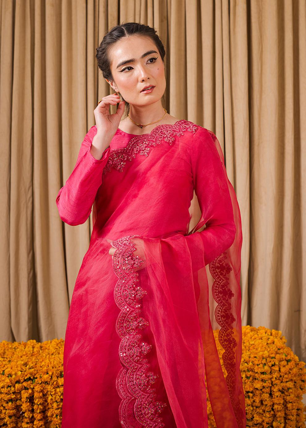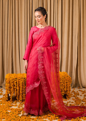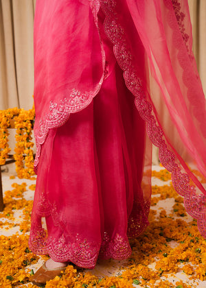 Elegance meets tradition in this stunning Taffy/Fuchsia pink saree, featuring delicate scallop embroidery on the pallu and a chic, fitted blouse with full sleeves. A perfect blend of grace and modern style.