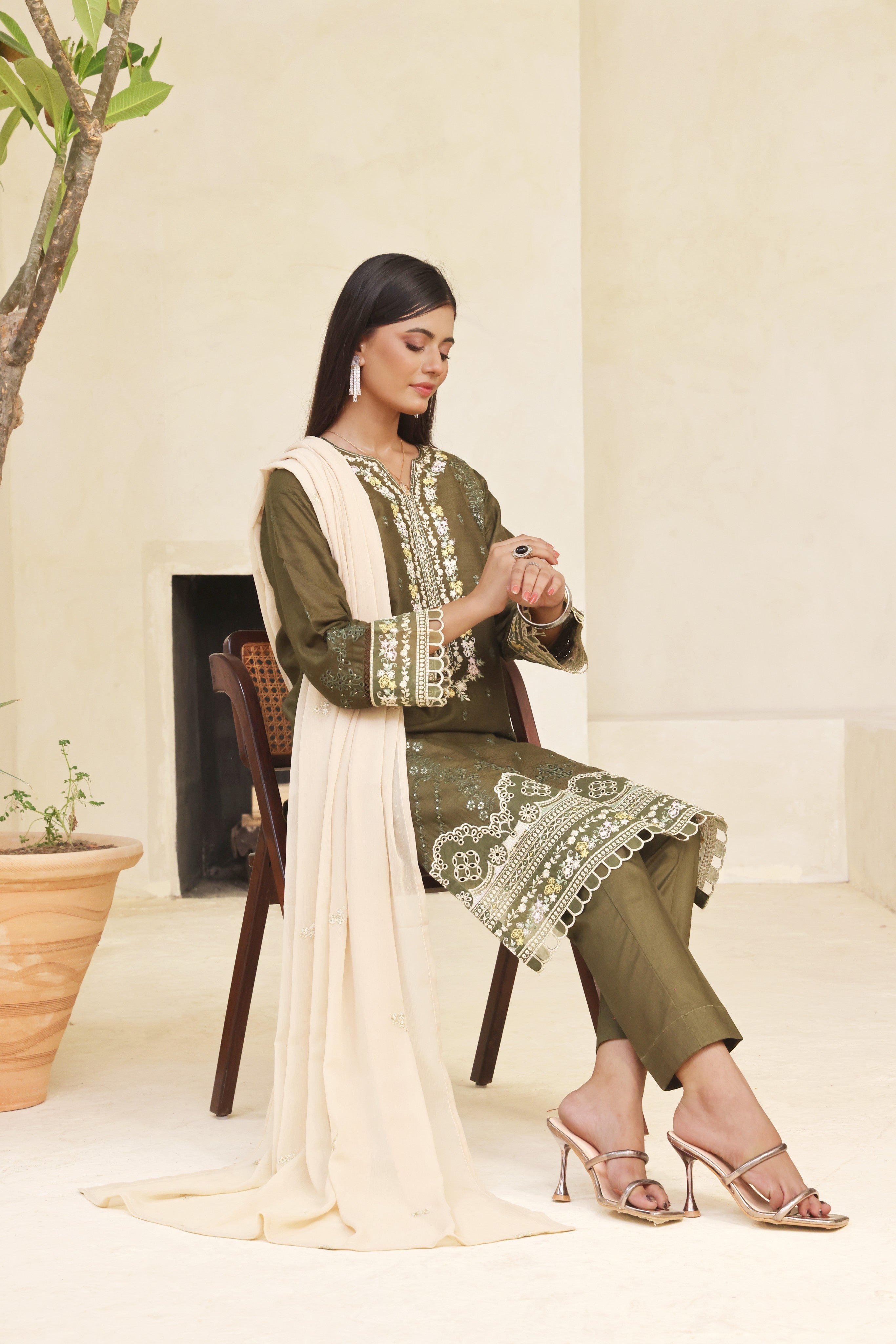 Embroidered Chiffon Dupatta – lightweight and delicately designed to complement the shirt.