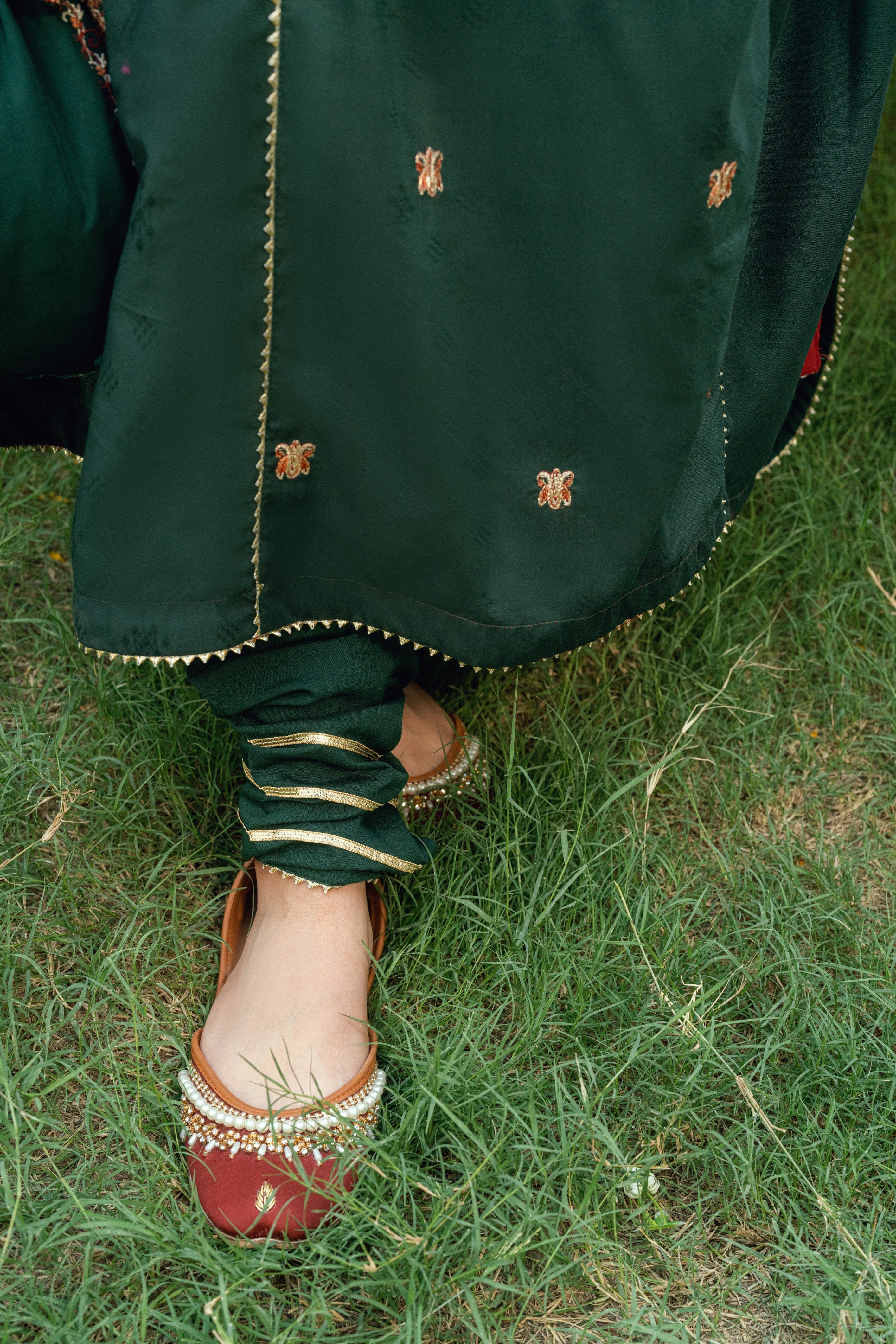 Shirt Details: Poly Jaquard deep bottle green embroidered flare paneled shirt with Round neckline with embroidered cut detail, Fitted sleeves with statement embroidery and pleats on panels to add flare with gota and paltawa finishing.