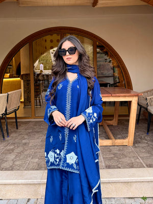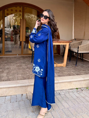 Three piece blue outfit made on pure ramen silk shirt and boxy trousers