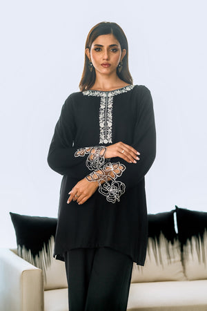 Step into timeless sophistication with our Noir Elegance Embroidered Set. This exquisite two-piece black dress is a masterpiece of style and craftsmanship, designed to make you stand out at any event.