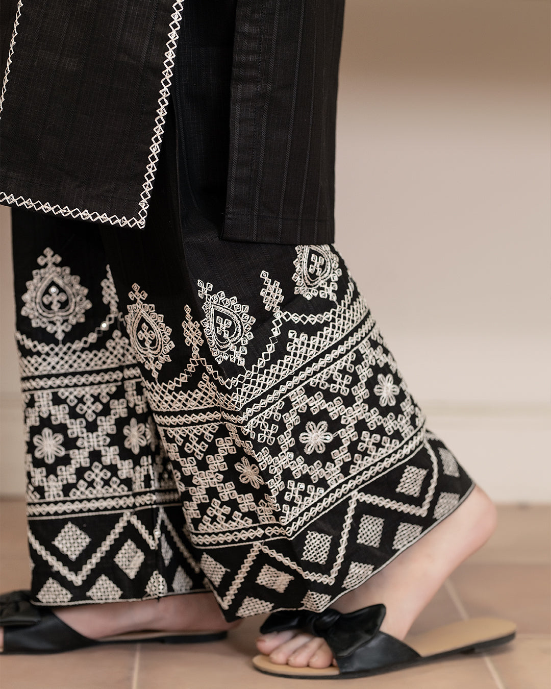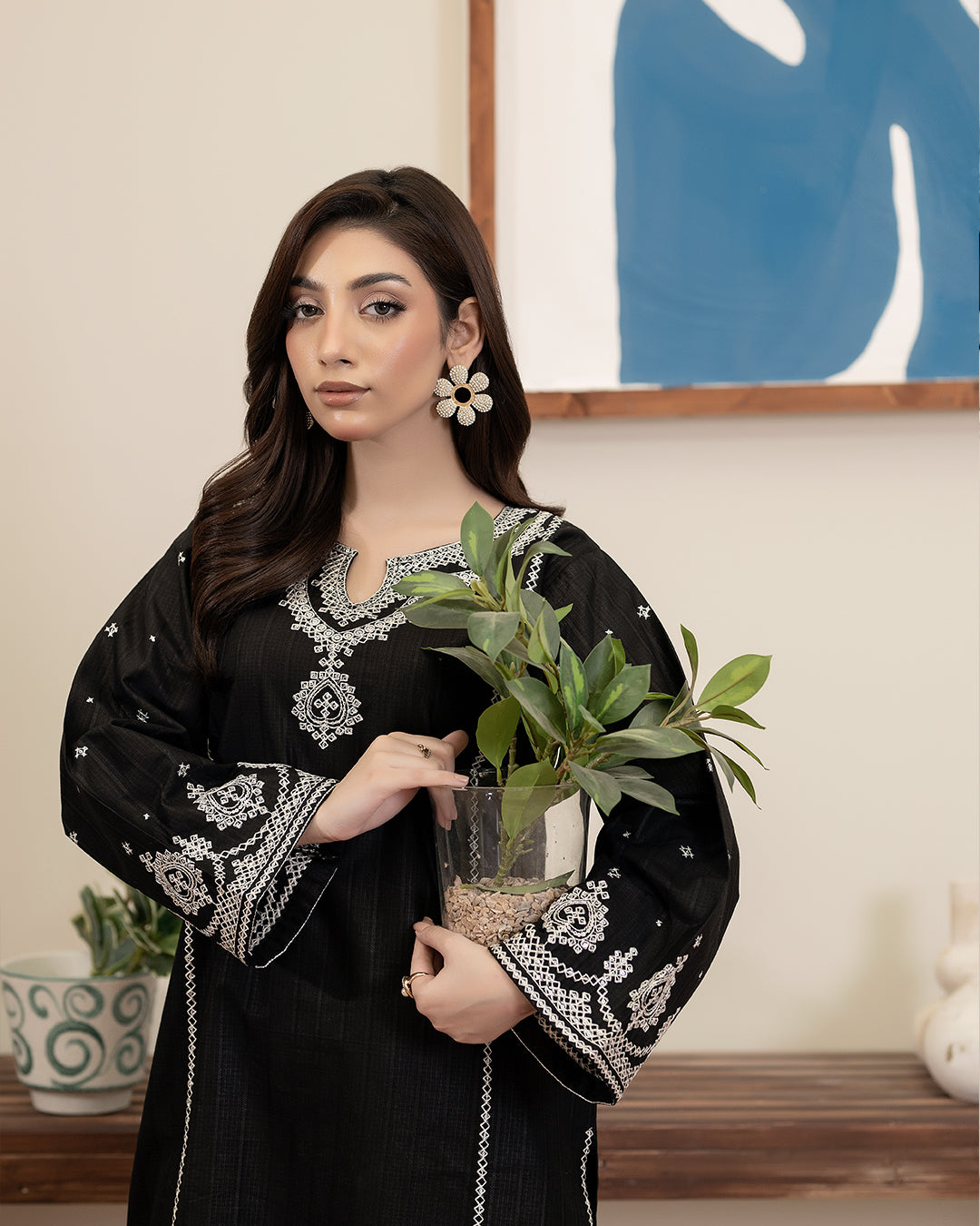 This exquisite Daily/Basic Wear Kurta Set is a winter wardrobe essential. The Straight Cut Kurta in luxurious Cotton Satin features intricate embroidered detailing. Paired with a classic Straight Trouser in comfortable Cotton fabric, this 2-piece set in sleek Black exudes elegance. Elevate your everyday style with this wardrobe staple from Flutterby.