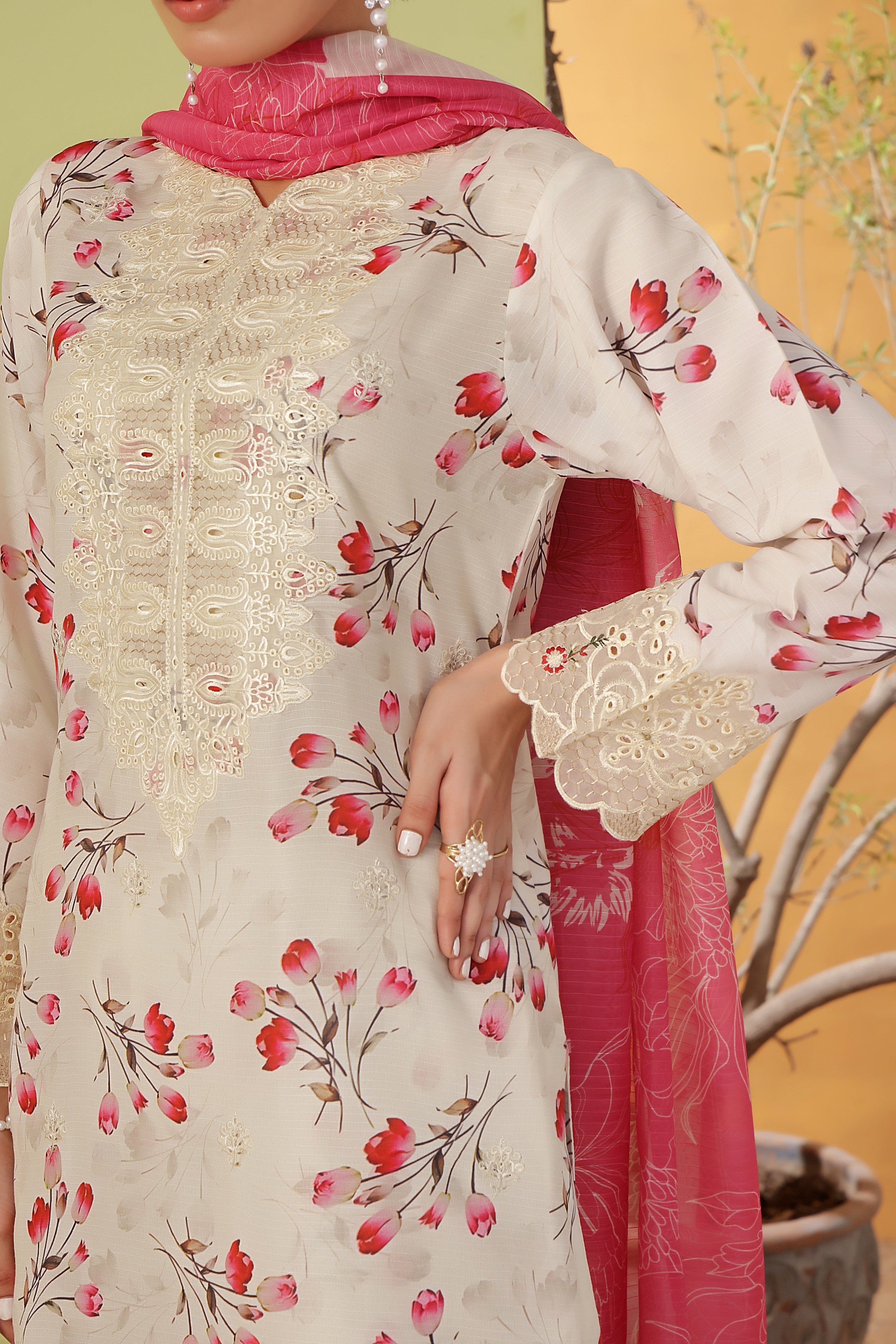 Dupatta: Digital printed premium chiffon – light, flowy, and elegant, perfect for a striking drape.
