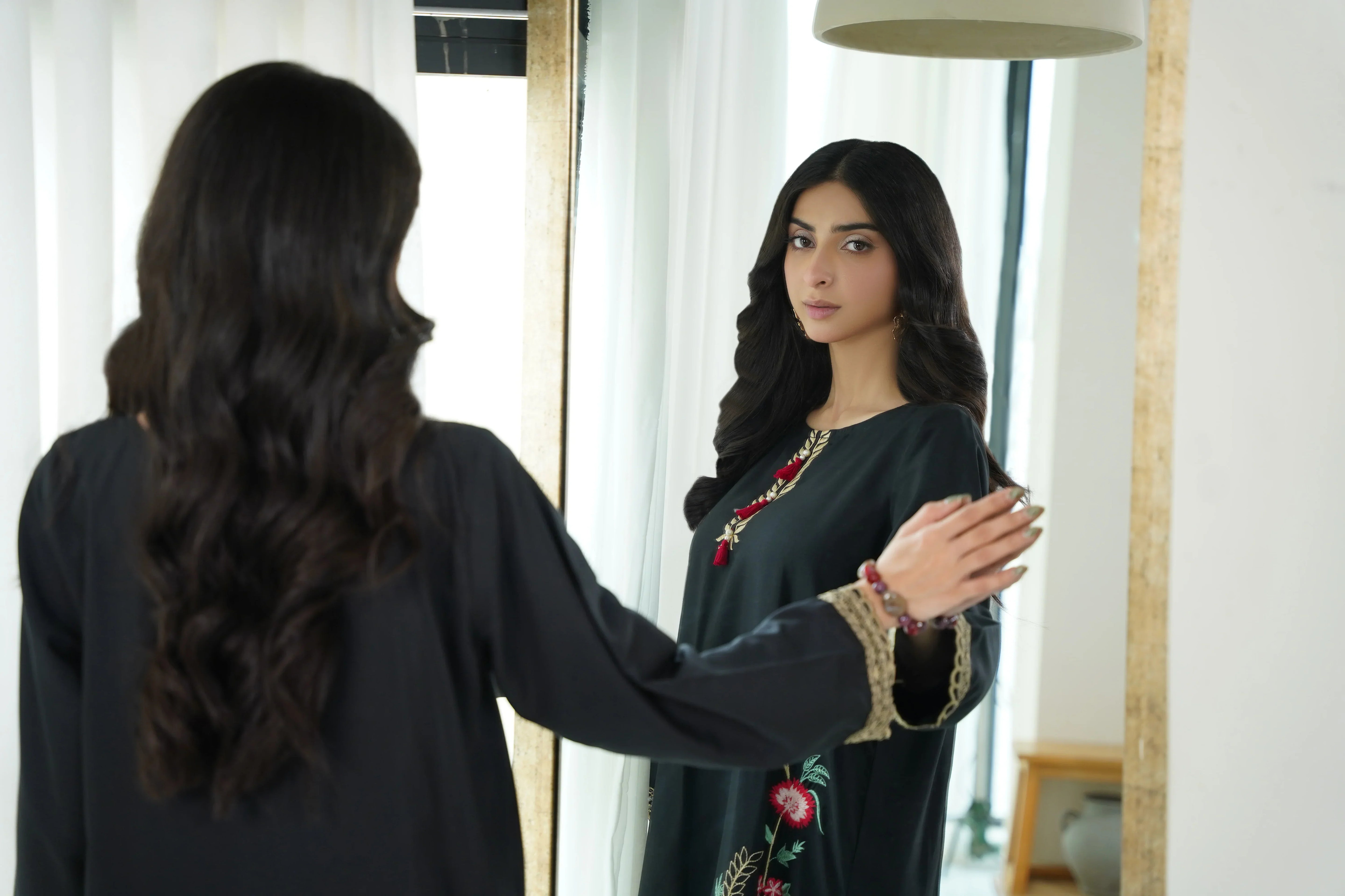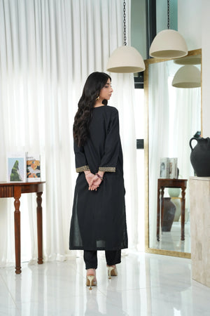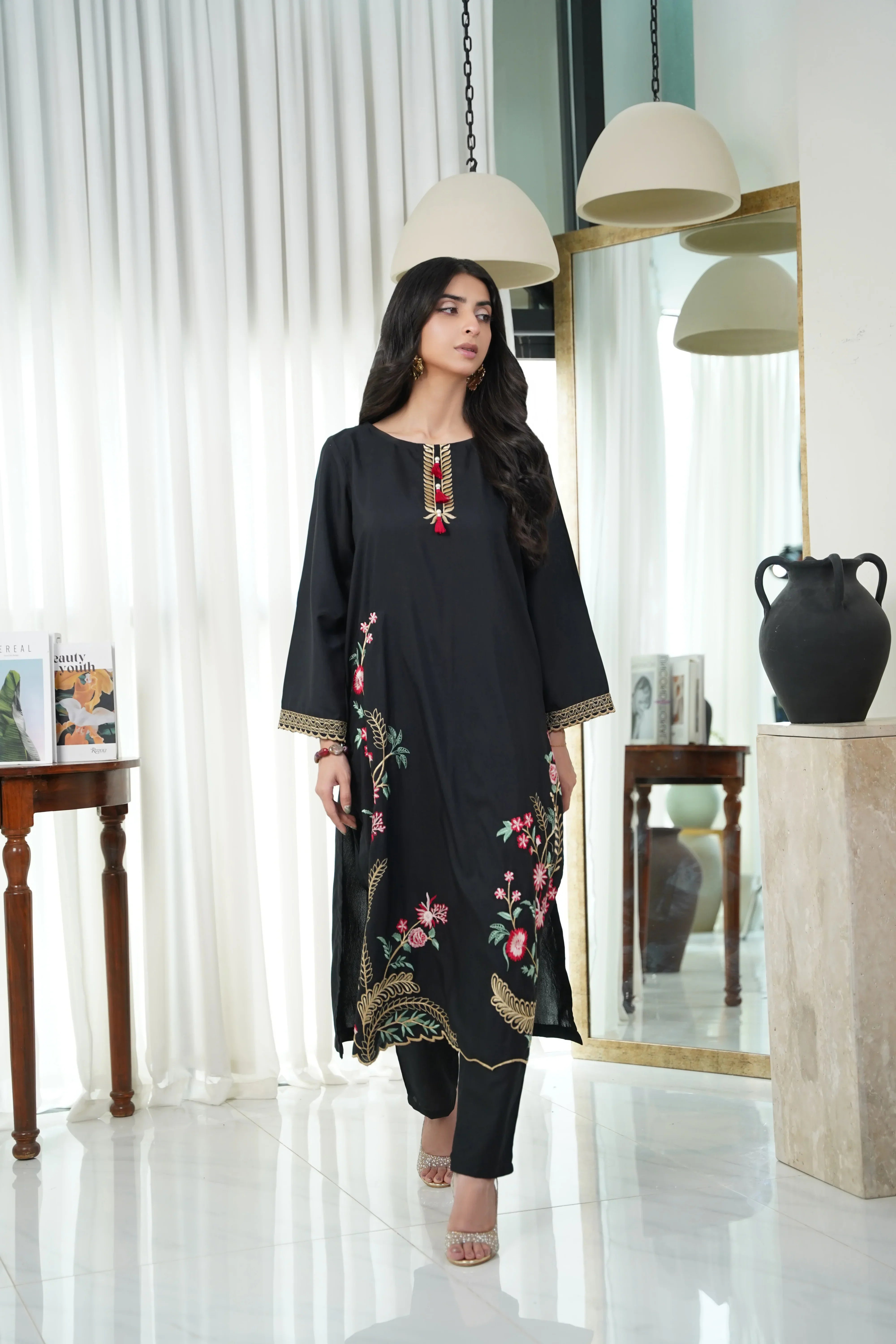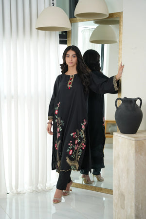 This article consists of a solid 2-piece set with an intricate embroidery detail touch on the shirt. The outfit consists of a long-length style shirt and fitted pants.