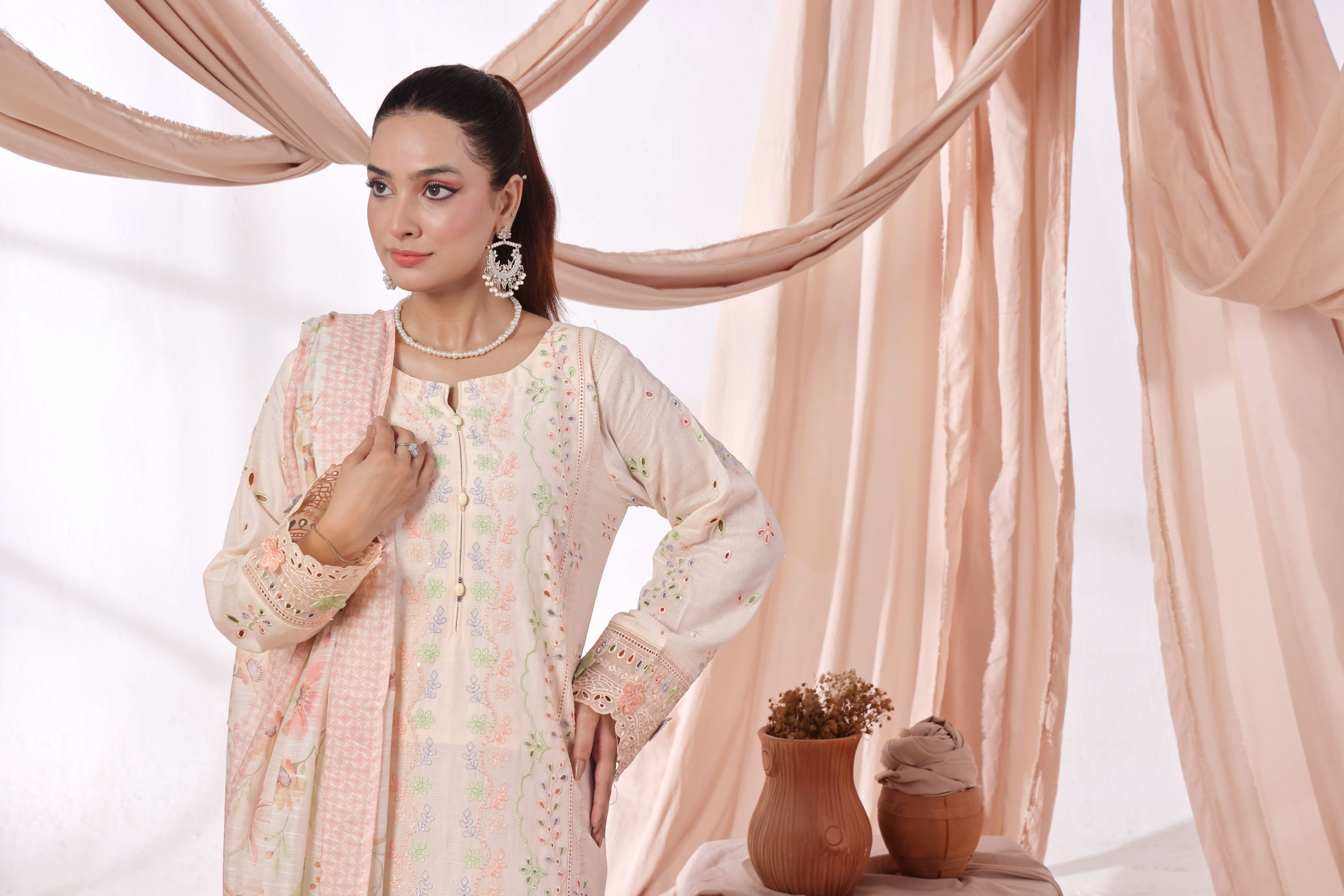 Elegant experience timeless grace with our Stitched Embroidered Jacquard Lawn Suit, blending modern design with traditional charm.