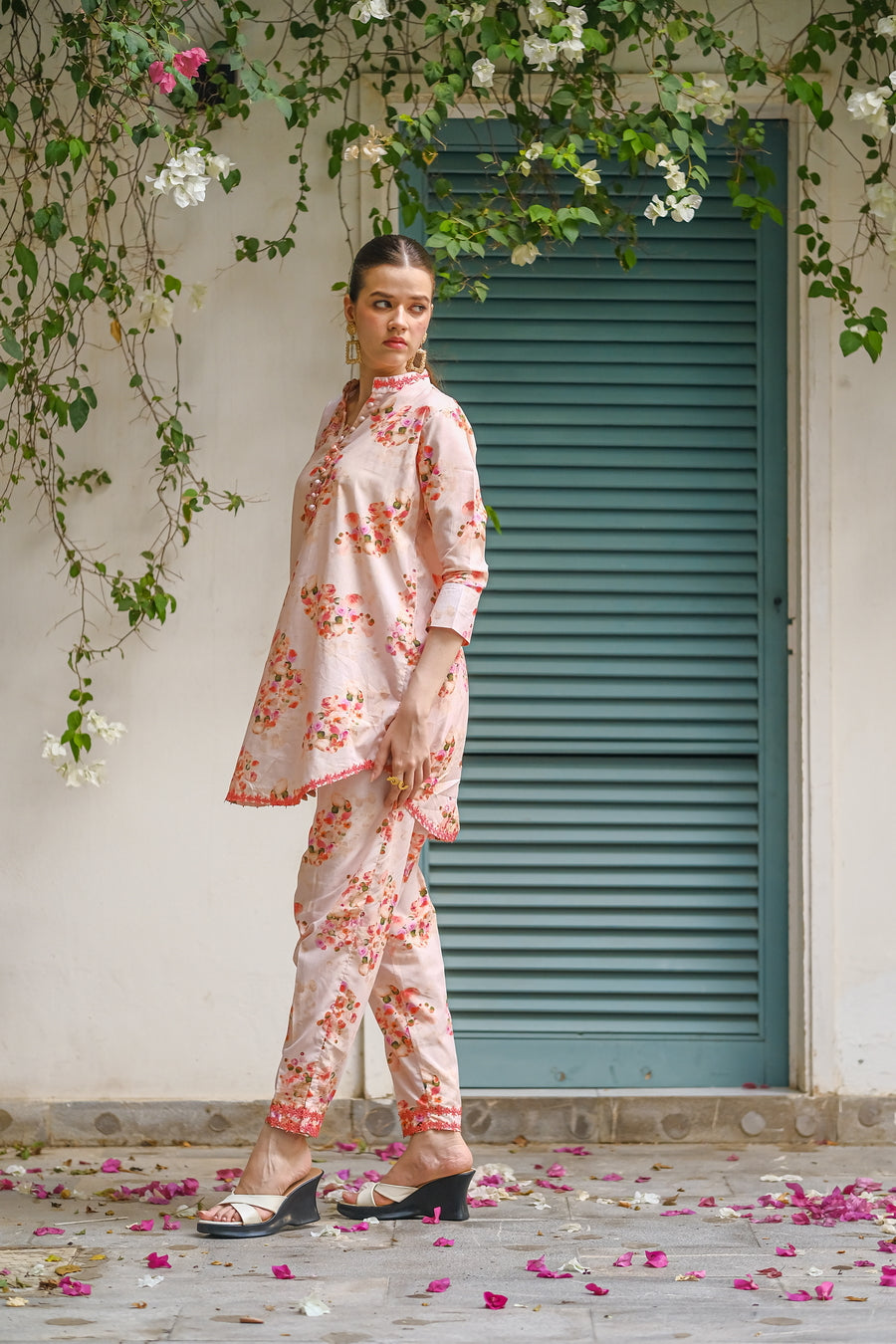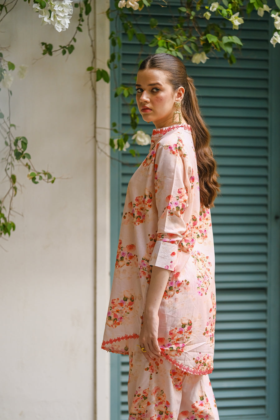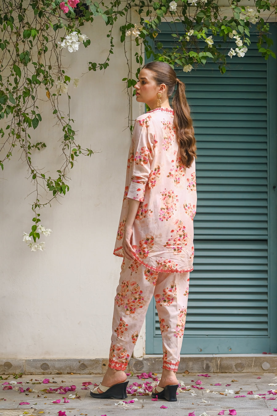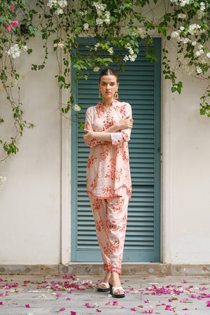 Embrace the delicate beauty of summer blooms with this pink cotton lawn outfit. The all-over print features a mix of pink, red, and purple flowers, creating a soft and feminine look. The breathable fabric keeps you cool and comfortable.