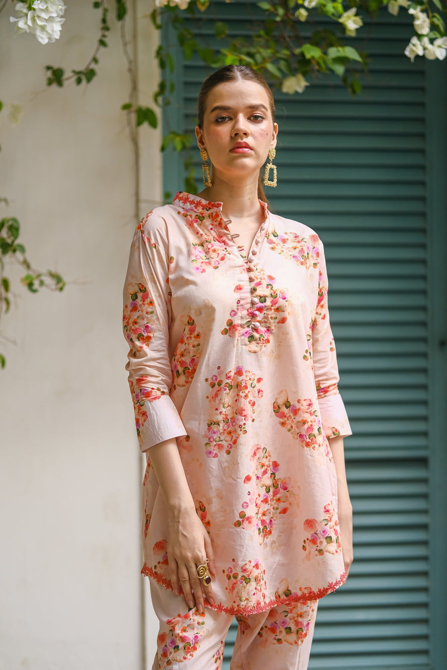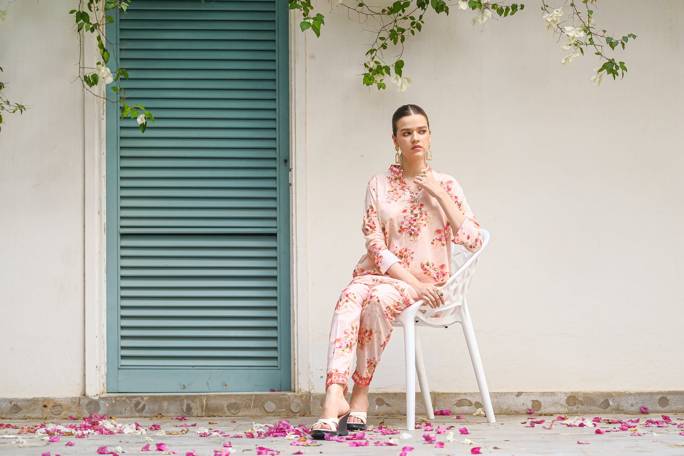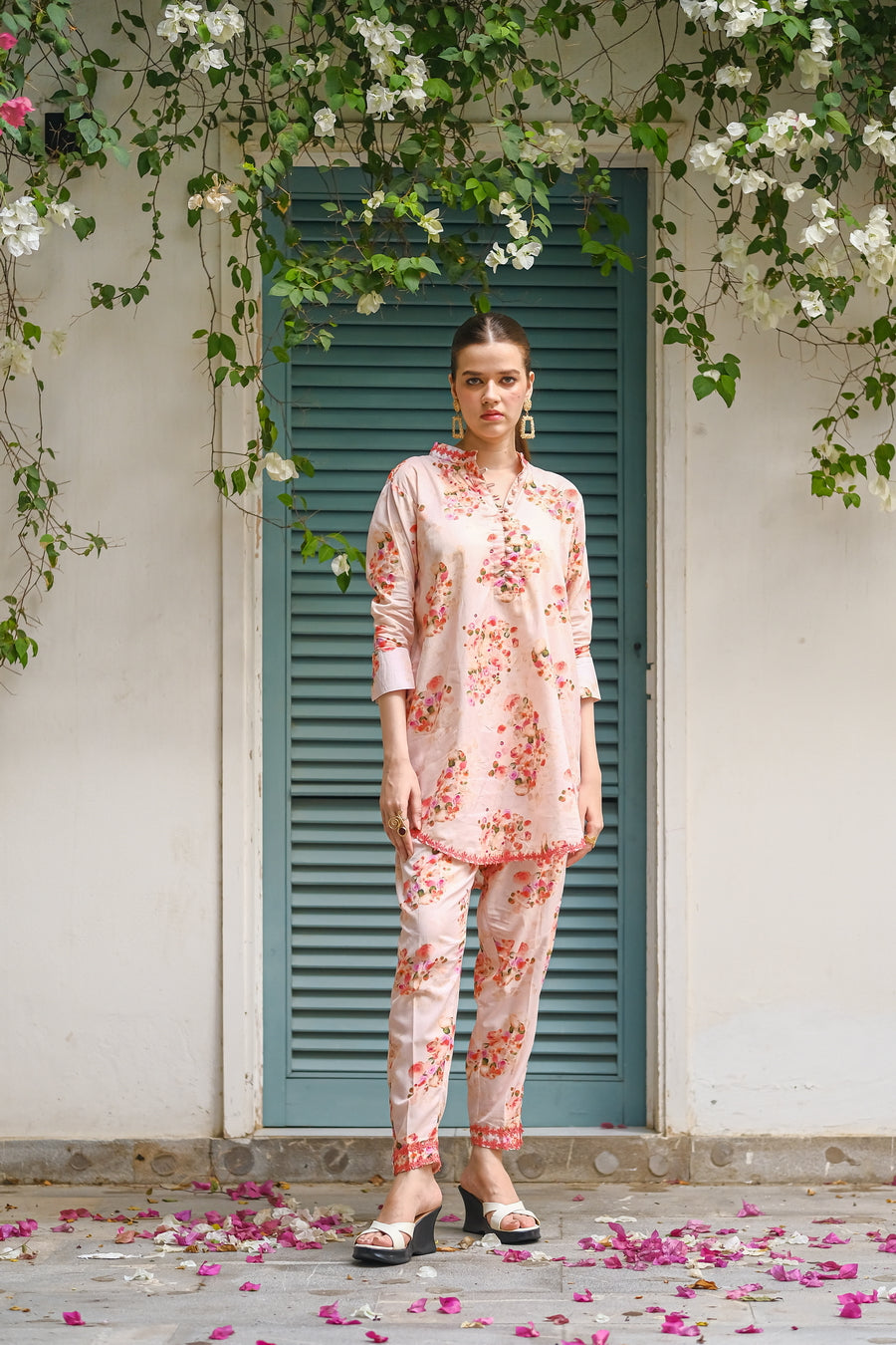 Embrace the delicate beauty of summer blooms with this pink cotton lawn outfit. The all-over print features a mix of pink, red, and purple flowers, creating a soft and feminine look. The breathable fabric keeps you cool and comfortable.