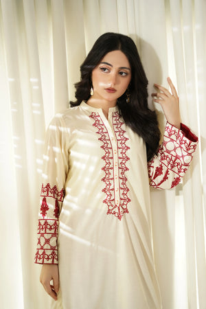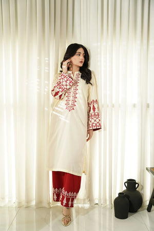 This article consists of a solid 2-piece set with an intricate embroidery detail touch on the shirt. The outfit consists of a long-length style shirt and fitted pants.