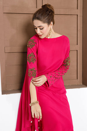 Dazzle in every step as you adorn this fusion grip georgette shirt in hot pink. An interesting fusion cut, the sleeves are intricately handworked with one side exaggerated, making a bold statement.