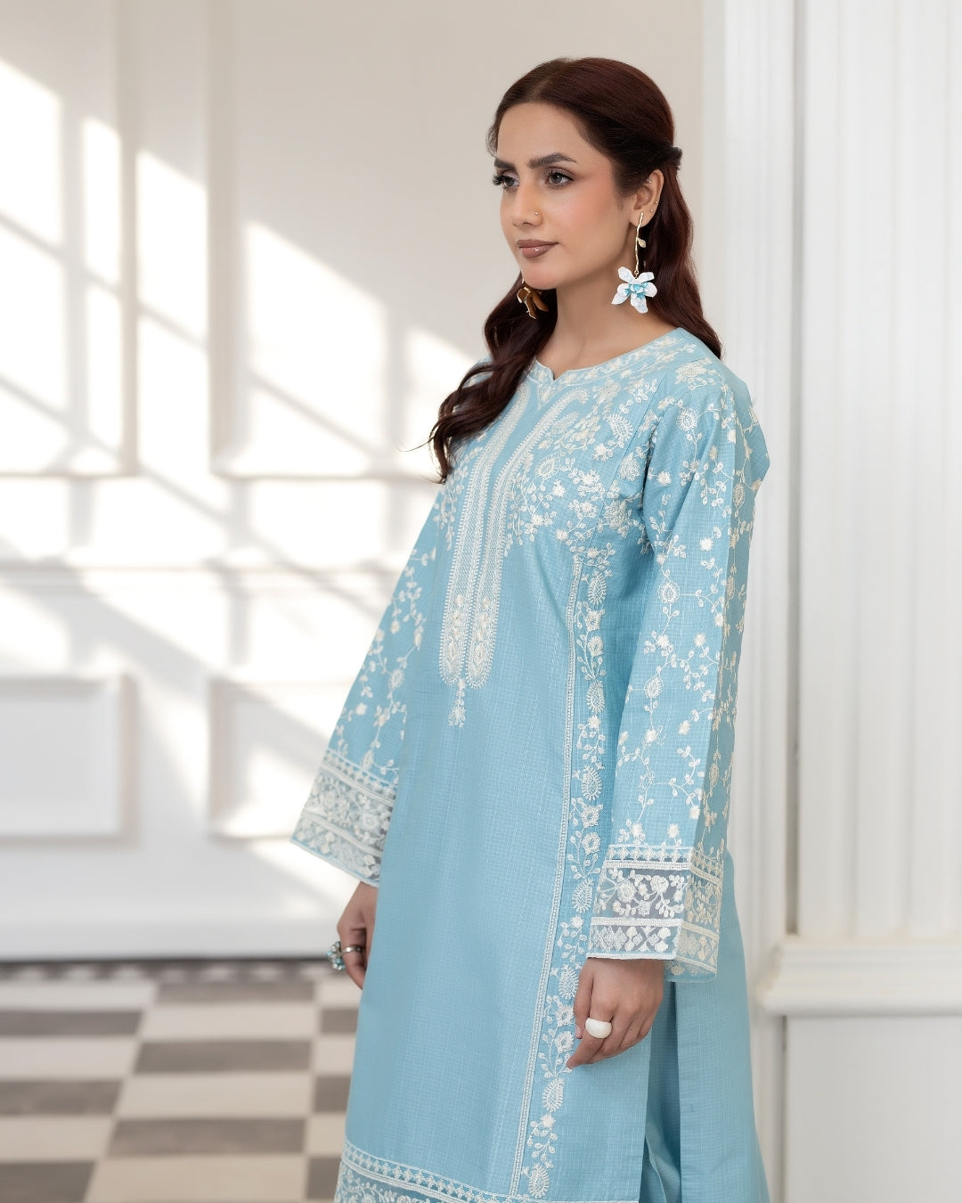 This exquisite Daily/Basic Wear Kurta Set is a winter wardrobe essential. The Straight Cut Kurta in luxurious Cotton Satin features intricate embroidered detailing. Paired with a classic Straight Trouser in comfortable Cotton fabric, this 2-piece set in sleek Black exudes elegance. Elevate your everyday style with this wardrobe staple from Flutterby.