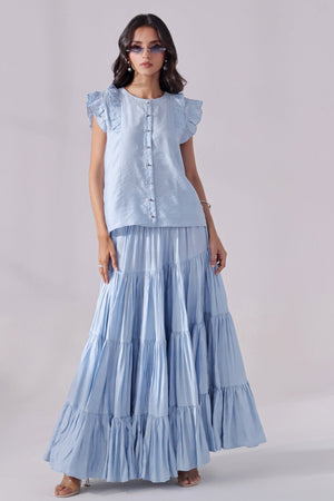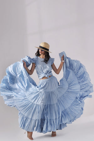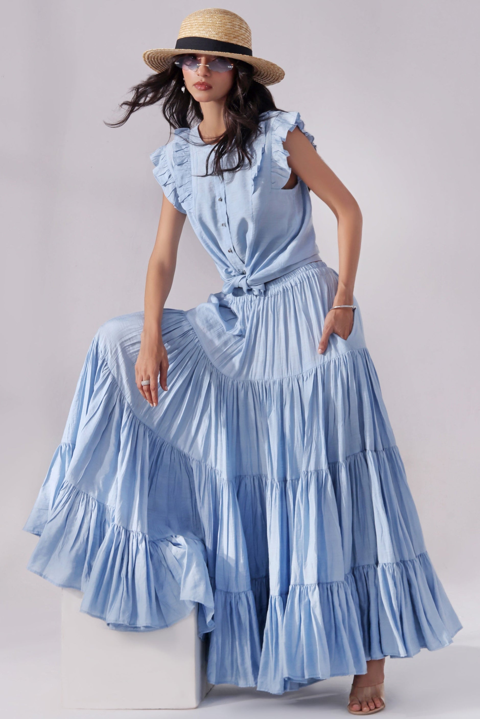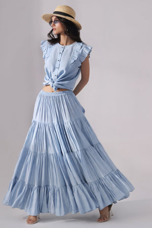 Elevate your summer style with our Sky Blue Tiered Skirt & Frill Crop Top Co-Ord Set, designed for effortless elegance and comfort.