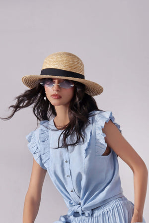 A front-open, sleeveless frill crop top adorned with delicate silver-tone buttons, giving a chic twist to a classic design. The frill detail adds a playful, feminine vibe perfect for brunches, beachside walks, or casual evenings.