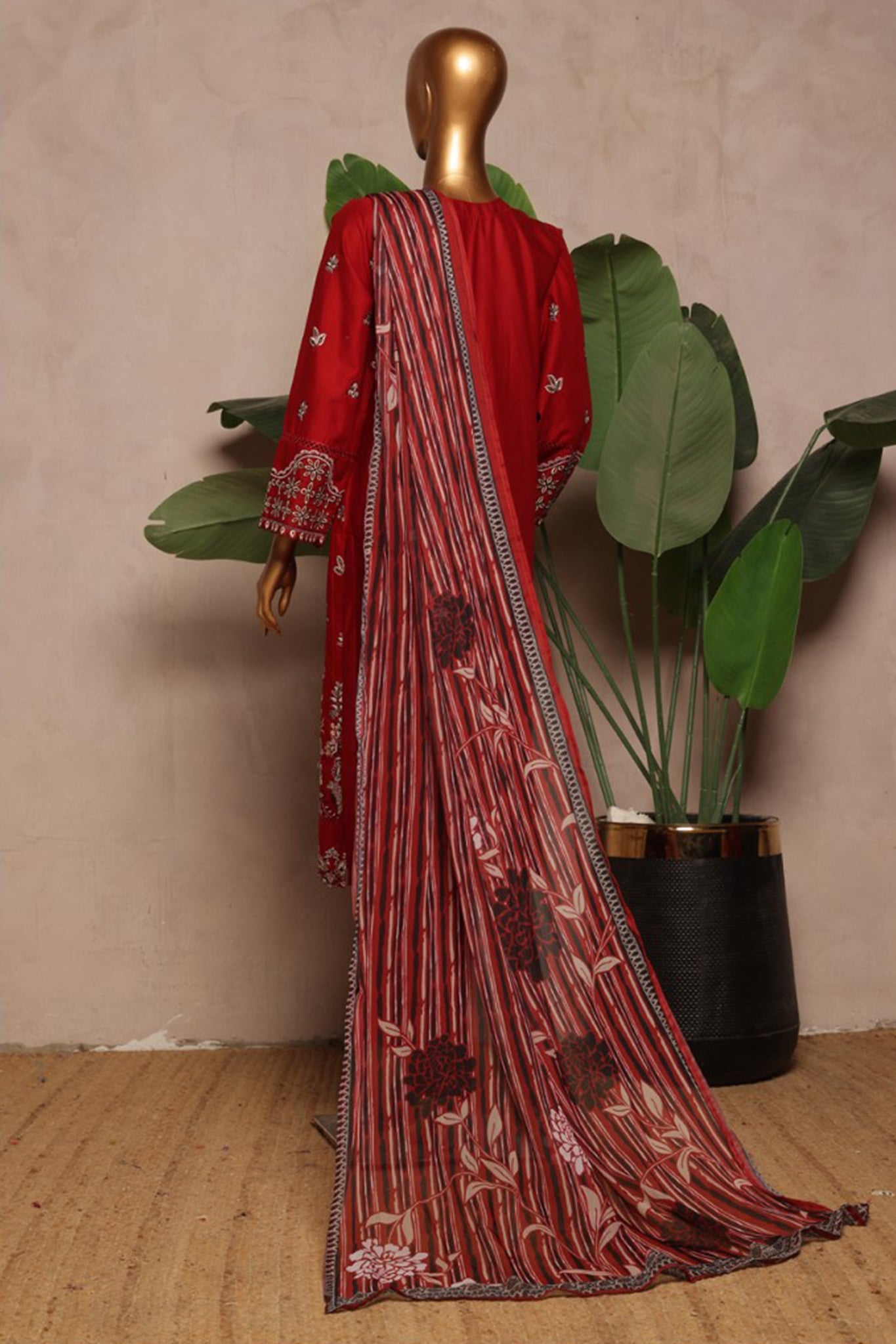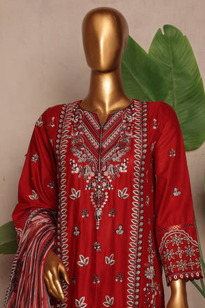 Bin Saeed Stitched 3 Piece Luxury Plain Cotton With Chiffon Dupatta Collection'2025-SMPC-1875-Red