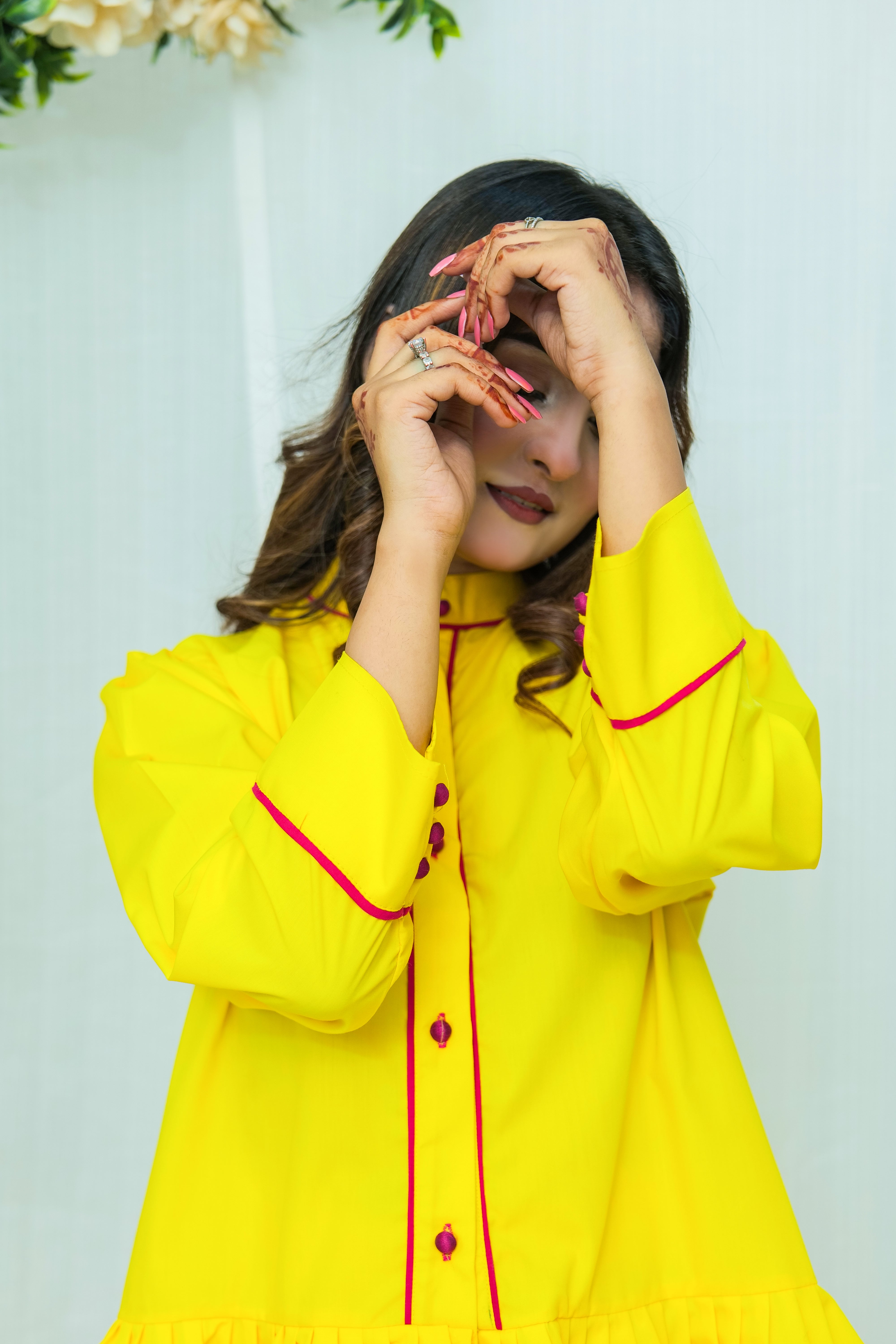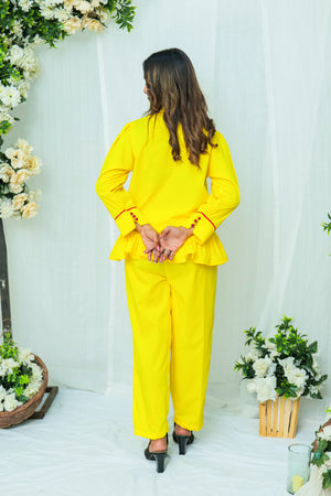 Bright, playful, and full of personality the Sunbeam 2-Piece Set is made to uplift your wardrobe with a burst of sunshine. Designed in a vibrant yellow hue, this modern Eastern ensemble features charming puff sleeves, a ruffle peplum hem, and contrast piping for a touch of bold detail.