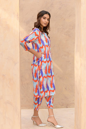 Elevate your ensemble with this tricolor dress with a trendy V-placket neckline paired with a matching shalwar for a harmonious blend of style and cultural flair.