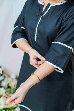 Tailored to perfection, the set features a flowy kurti with fine accents along the neckline and sleeves, paired with comfortable straight trousers. The clean lines and relaxed fit make it ideal for day-to-day wear without compromising on style. Whether you're heading to the office, running errands, or enjoying a casual lunch, Noir adds an effortless charm to your look.