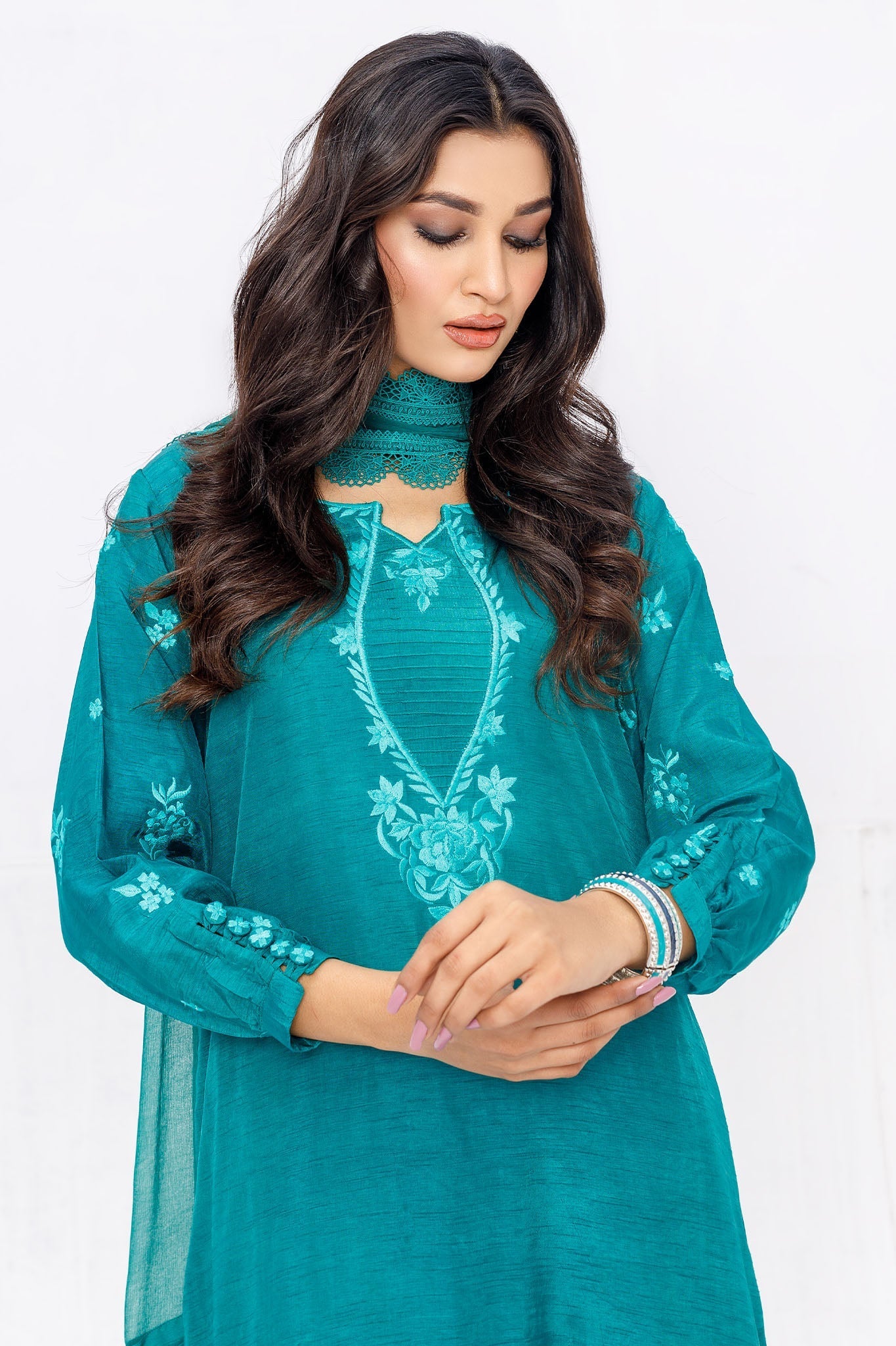A traditional look in aqua green with beautiful matching embroidery on the neckline, sleeves and daman. Get it with lace finishing and pleats around the dupatta, creating a harmonious blend of elegance and detailing.