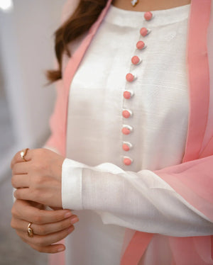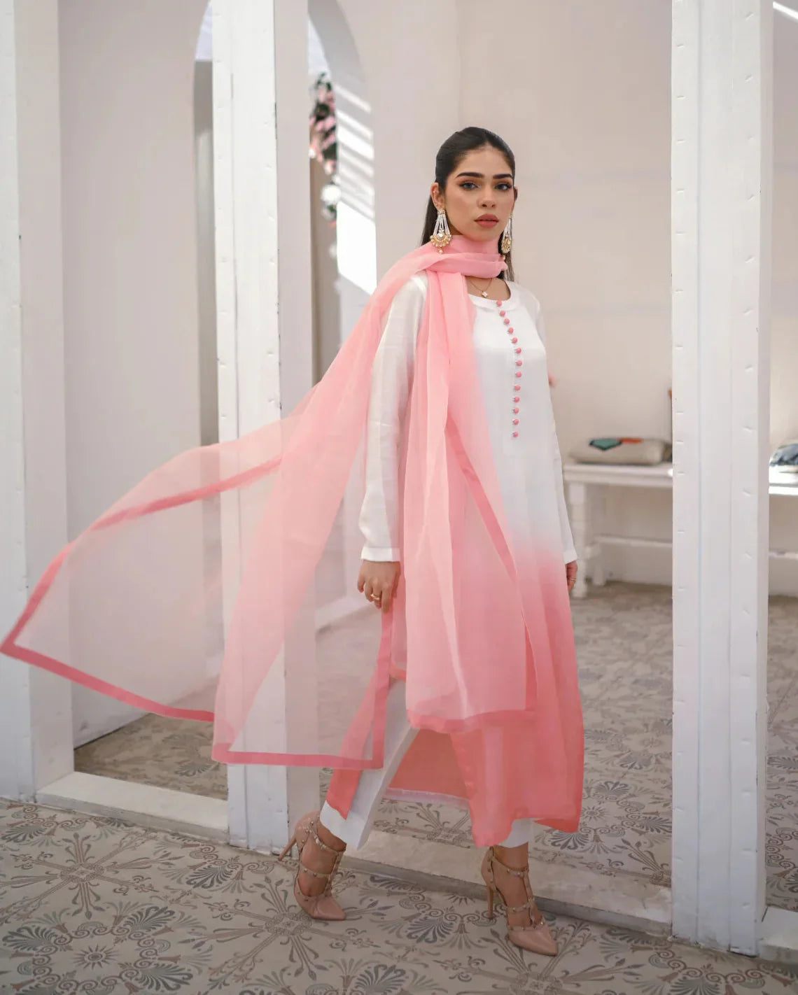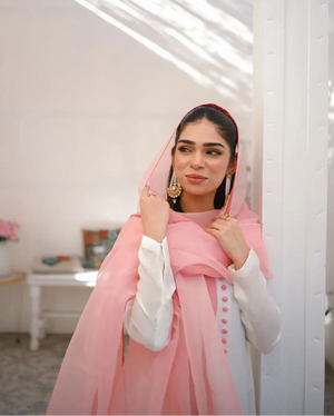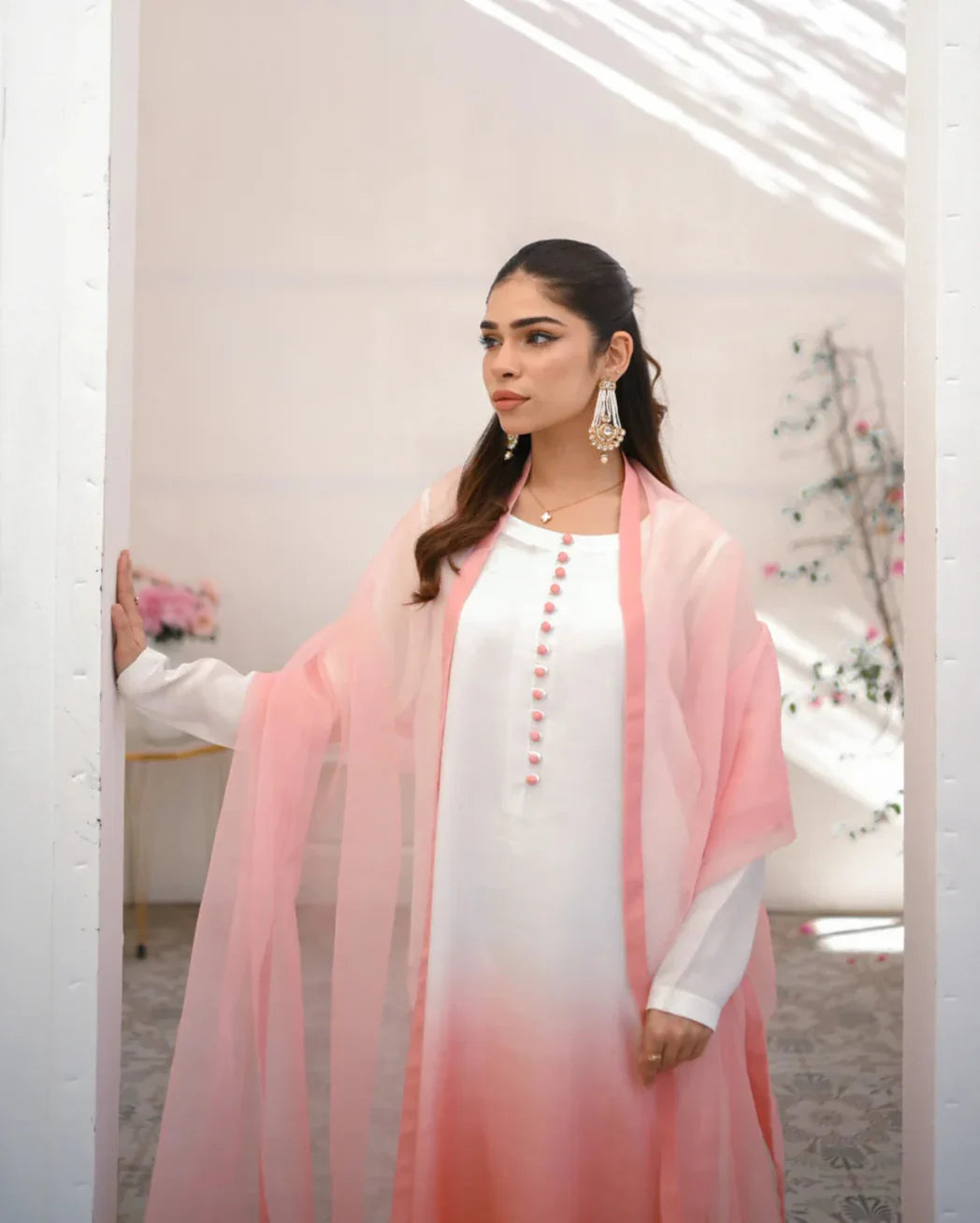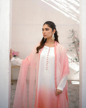 It’s a three piece dress includes a long ombre shirt and trouser along with organza dupatta.