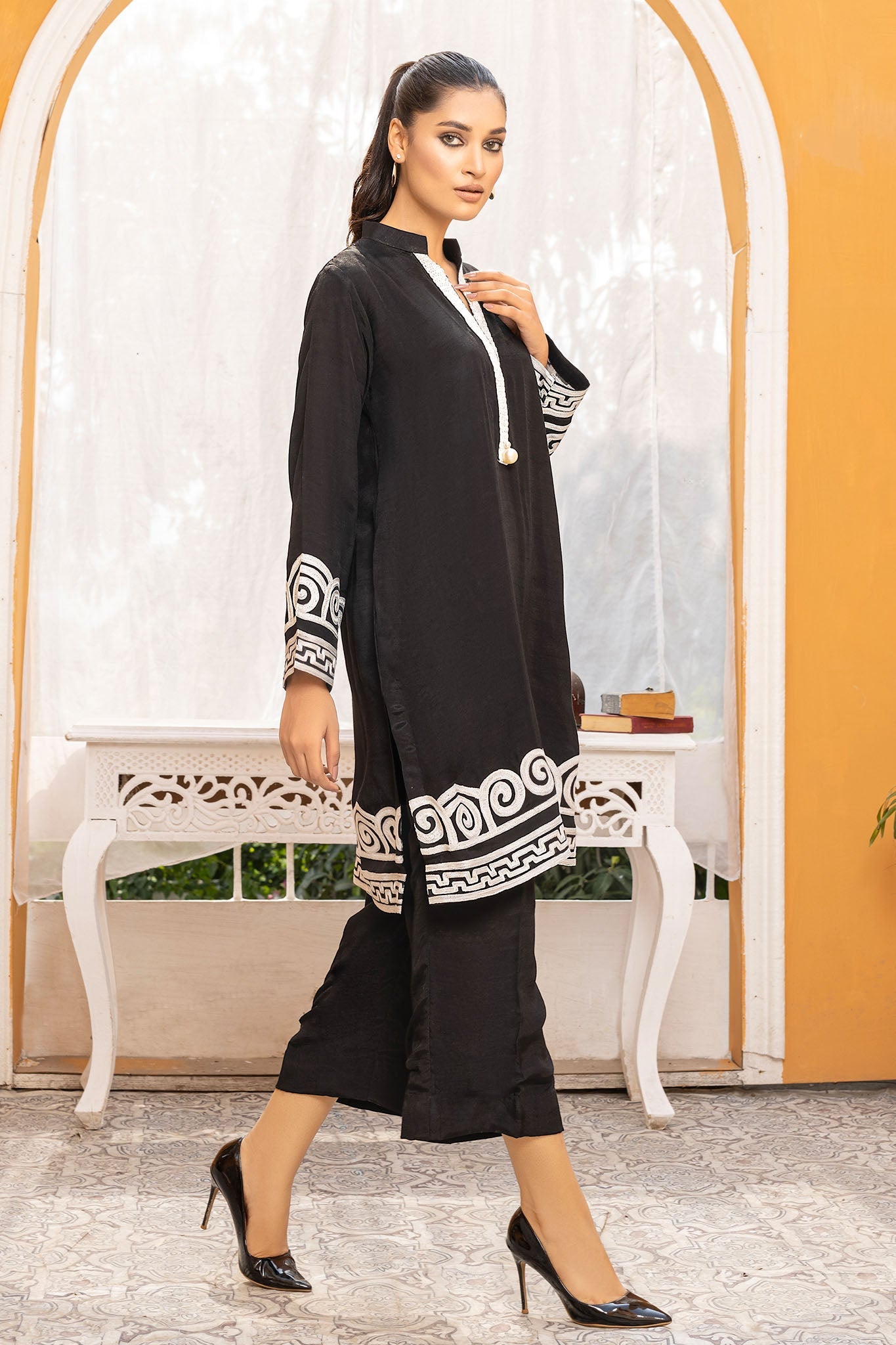 A monochrome kurta in dull silk with aari embroidery on the cuffs and daman. An absolute must have for your casual evening soir?.