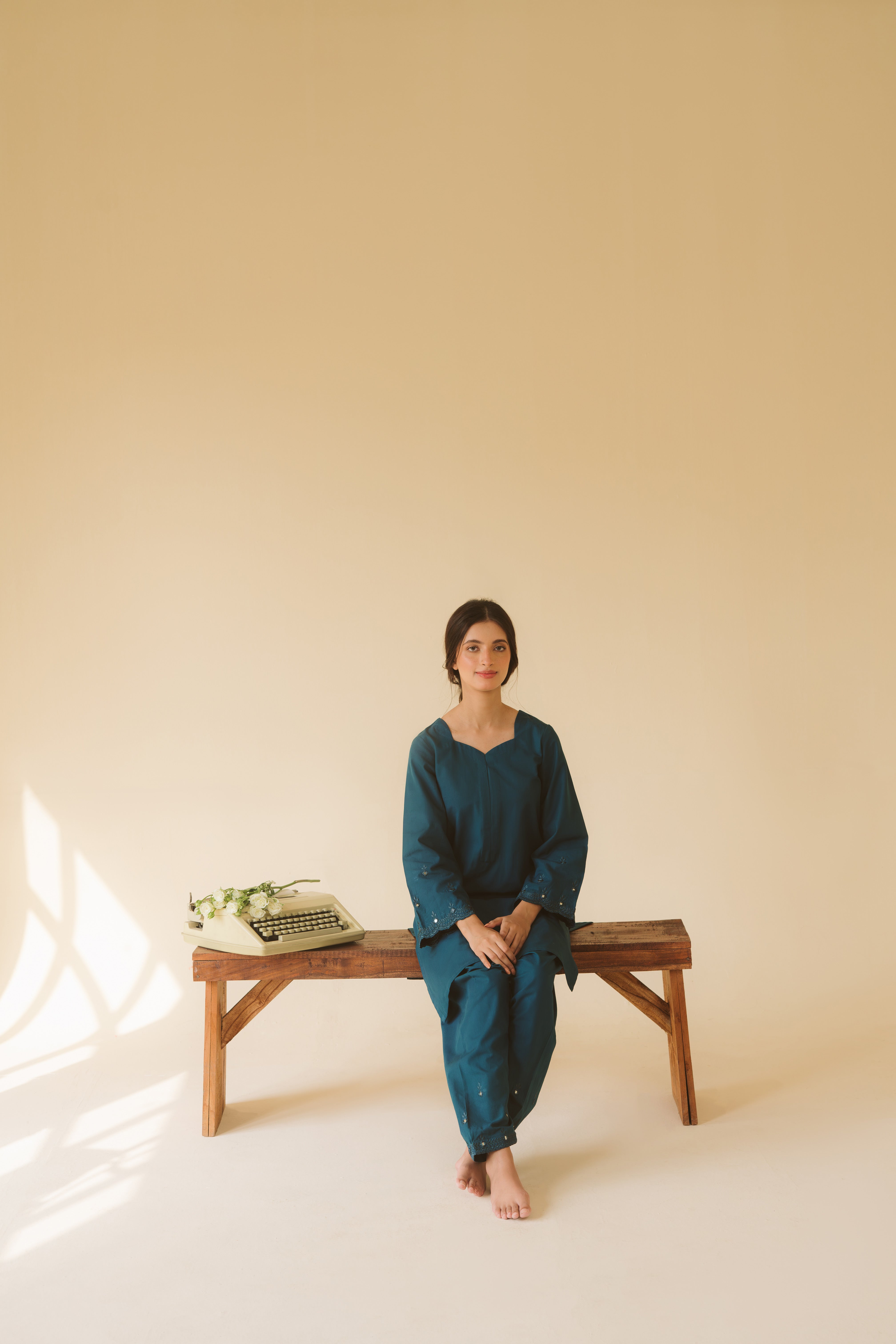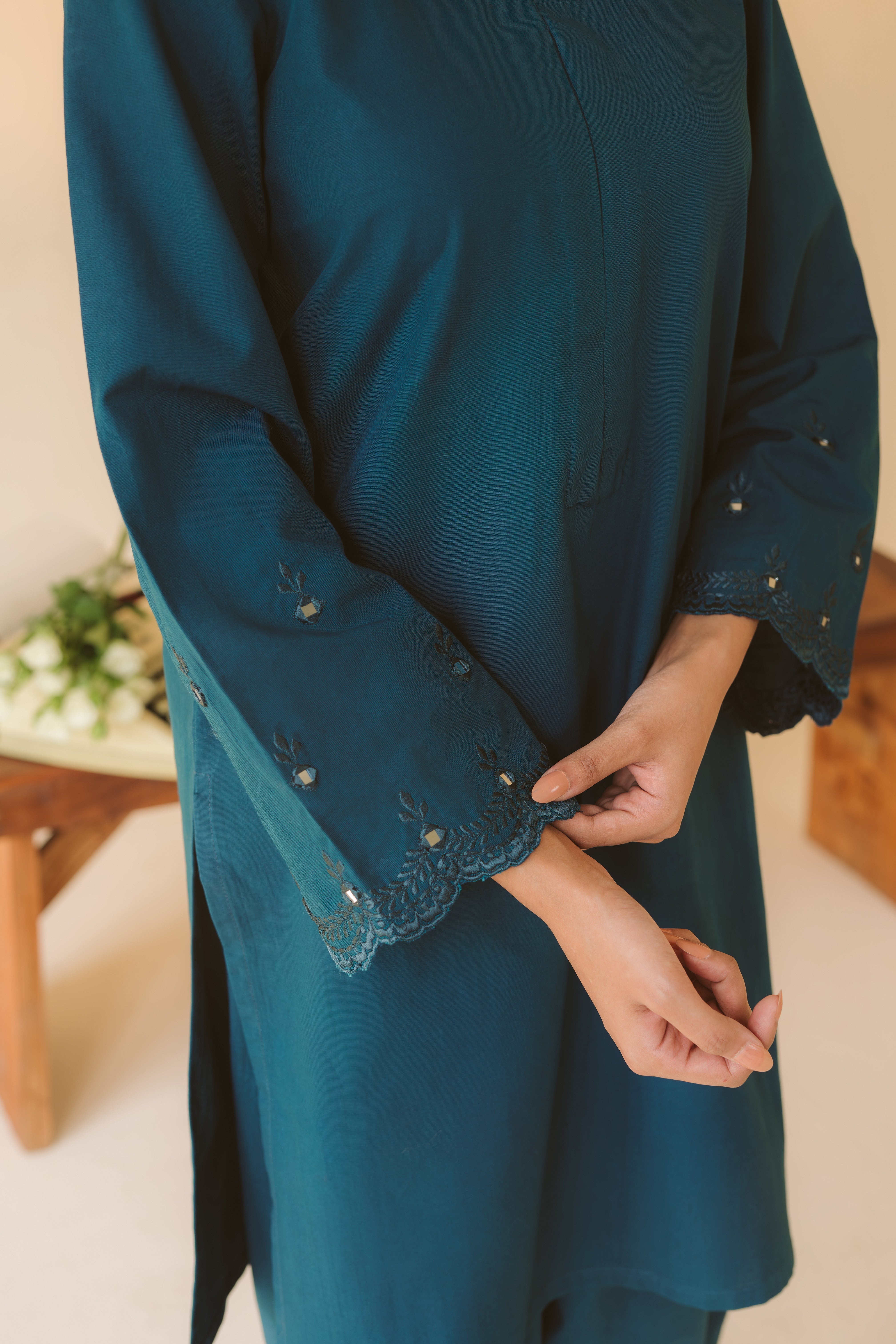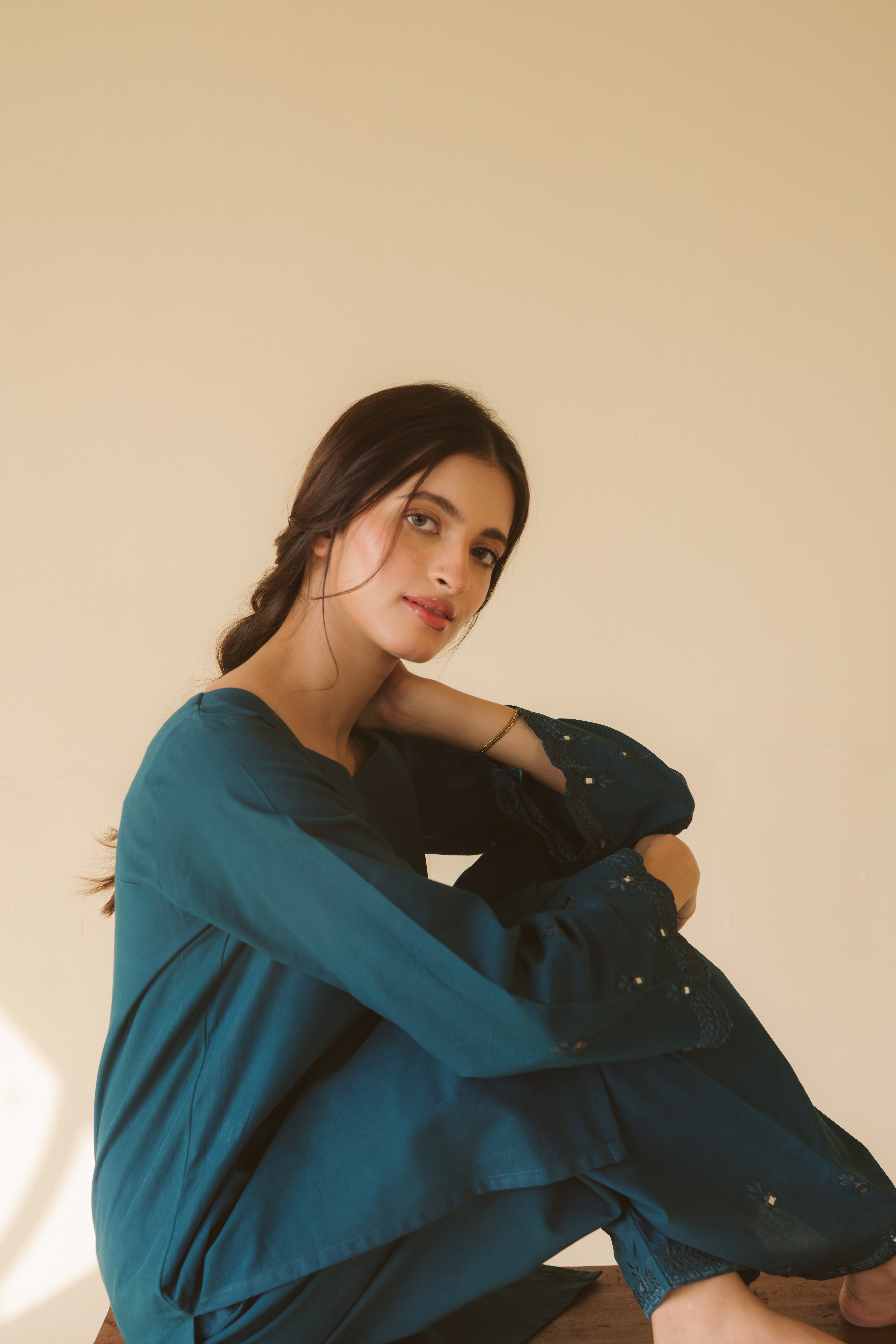 A Zinc Blue Co-ord in Dhanak Marina with mirror embroidery details on sleeves and shalwar.