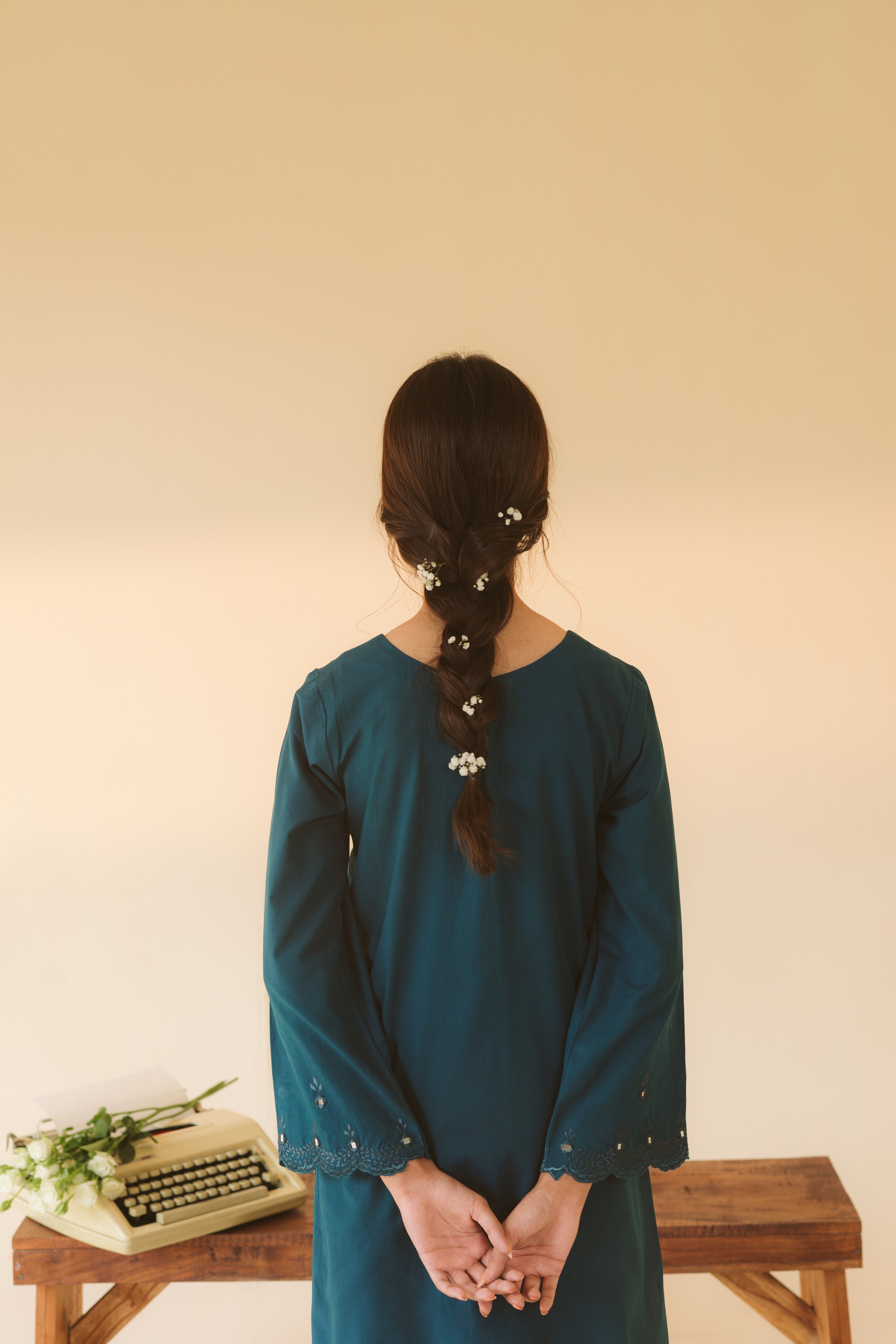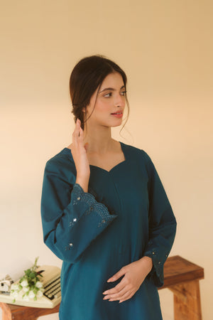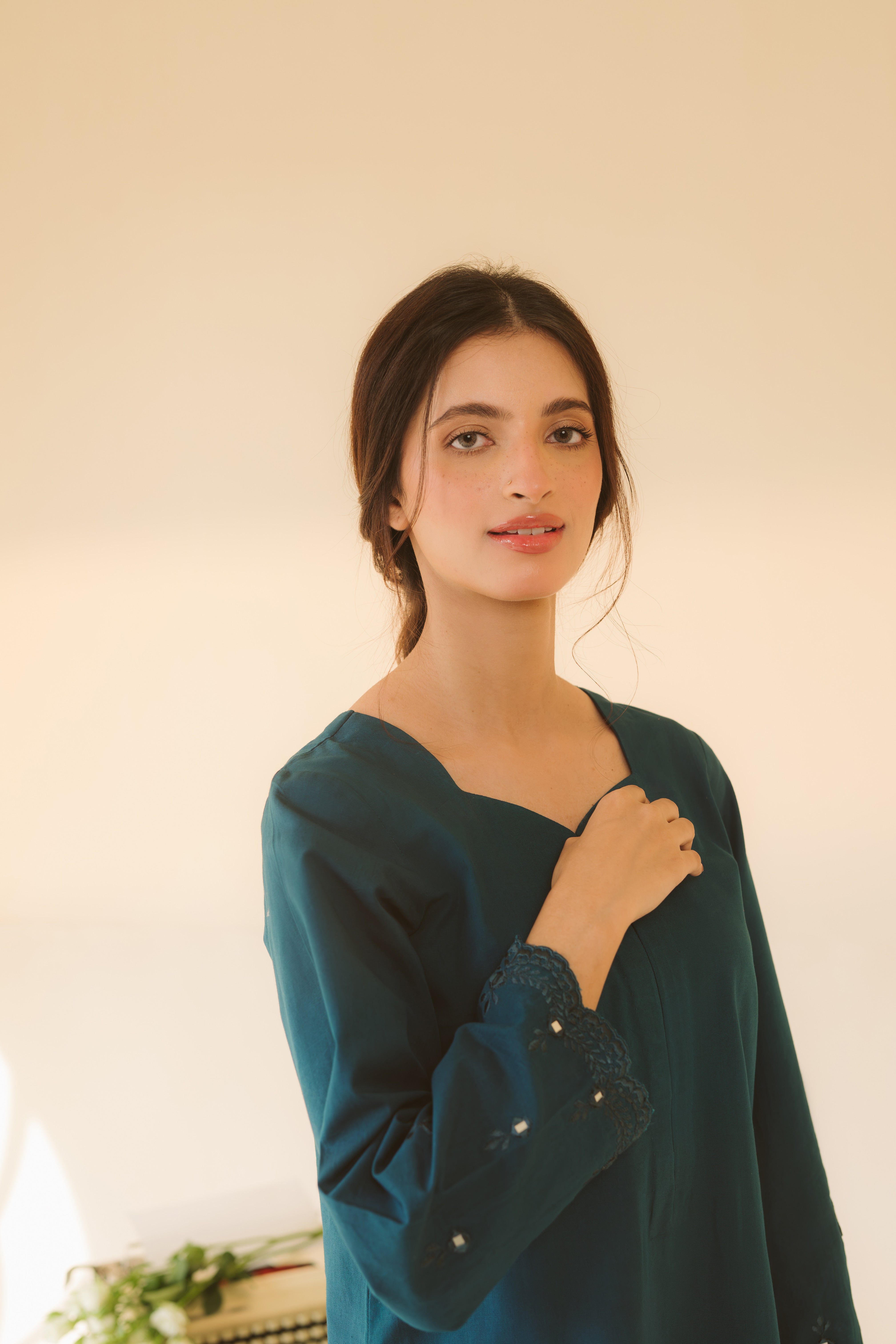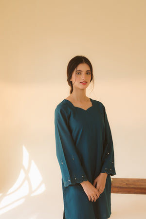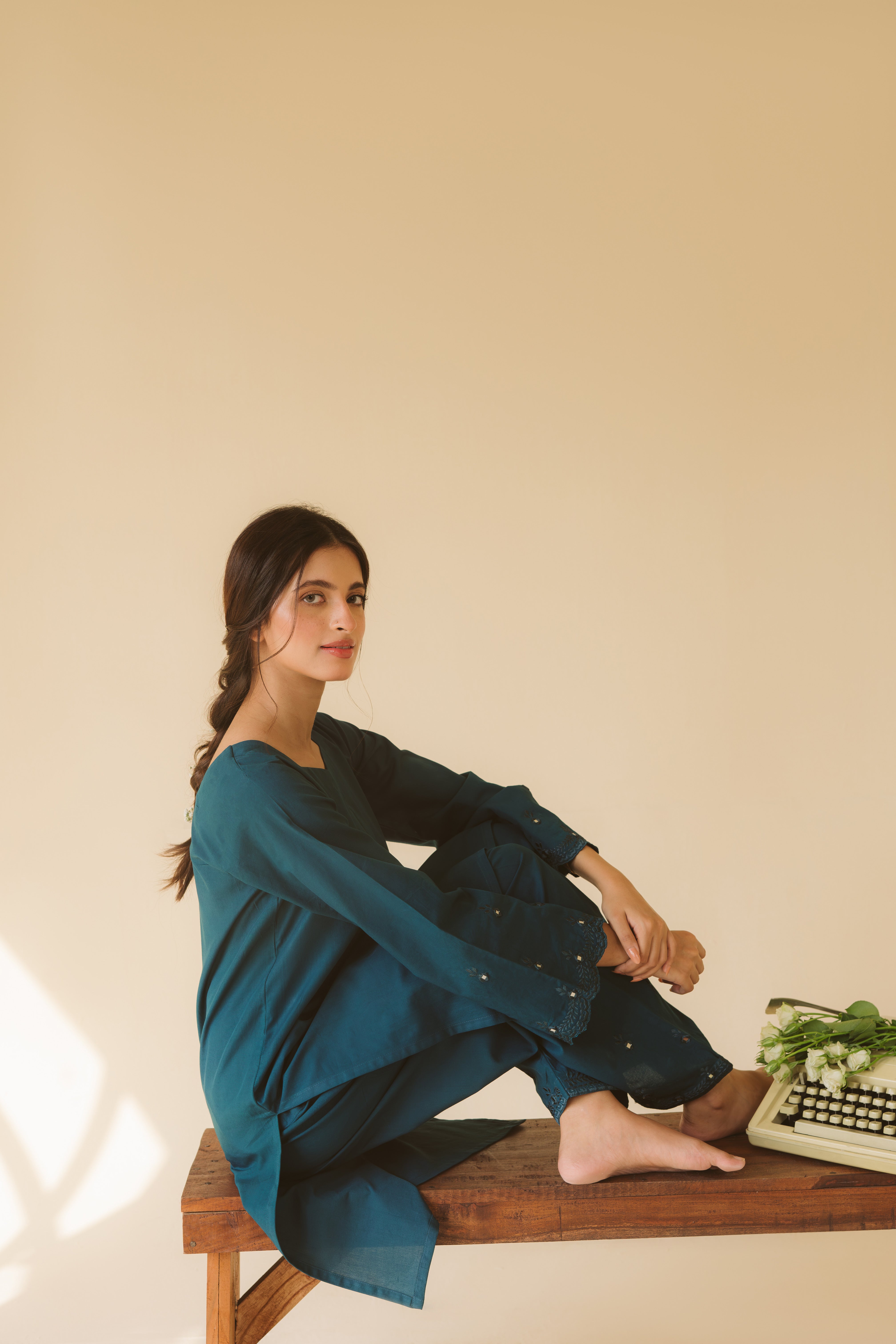 A Zinc Blue Co-ord in Dhanak Marina with mirror embroidery details on sleeves and shalwar.