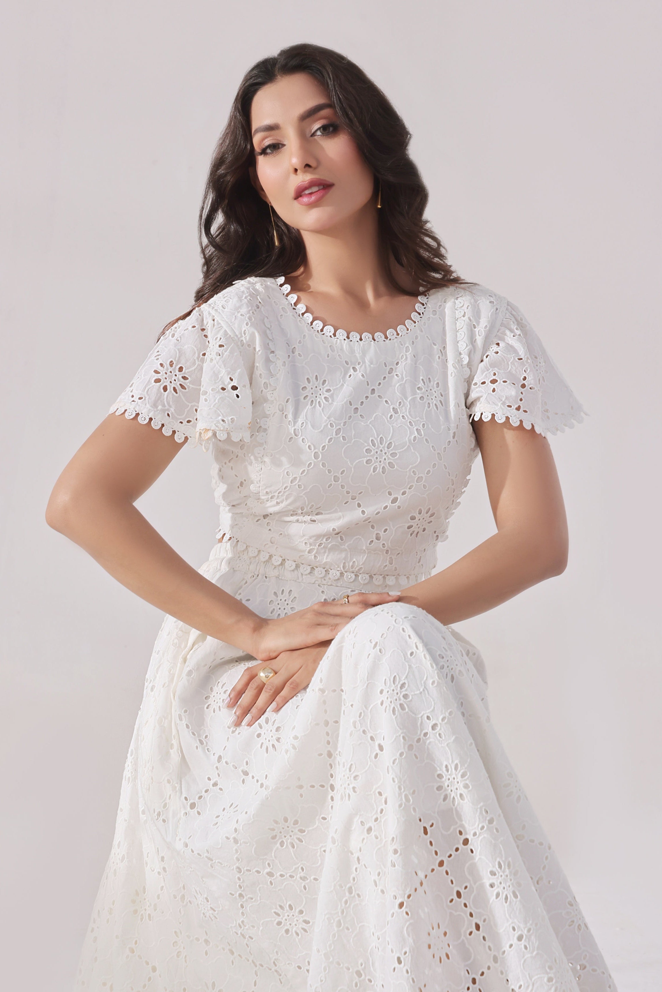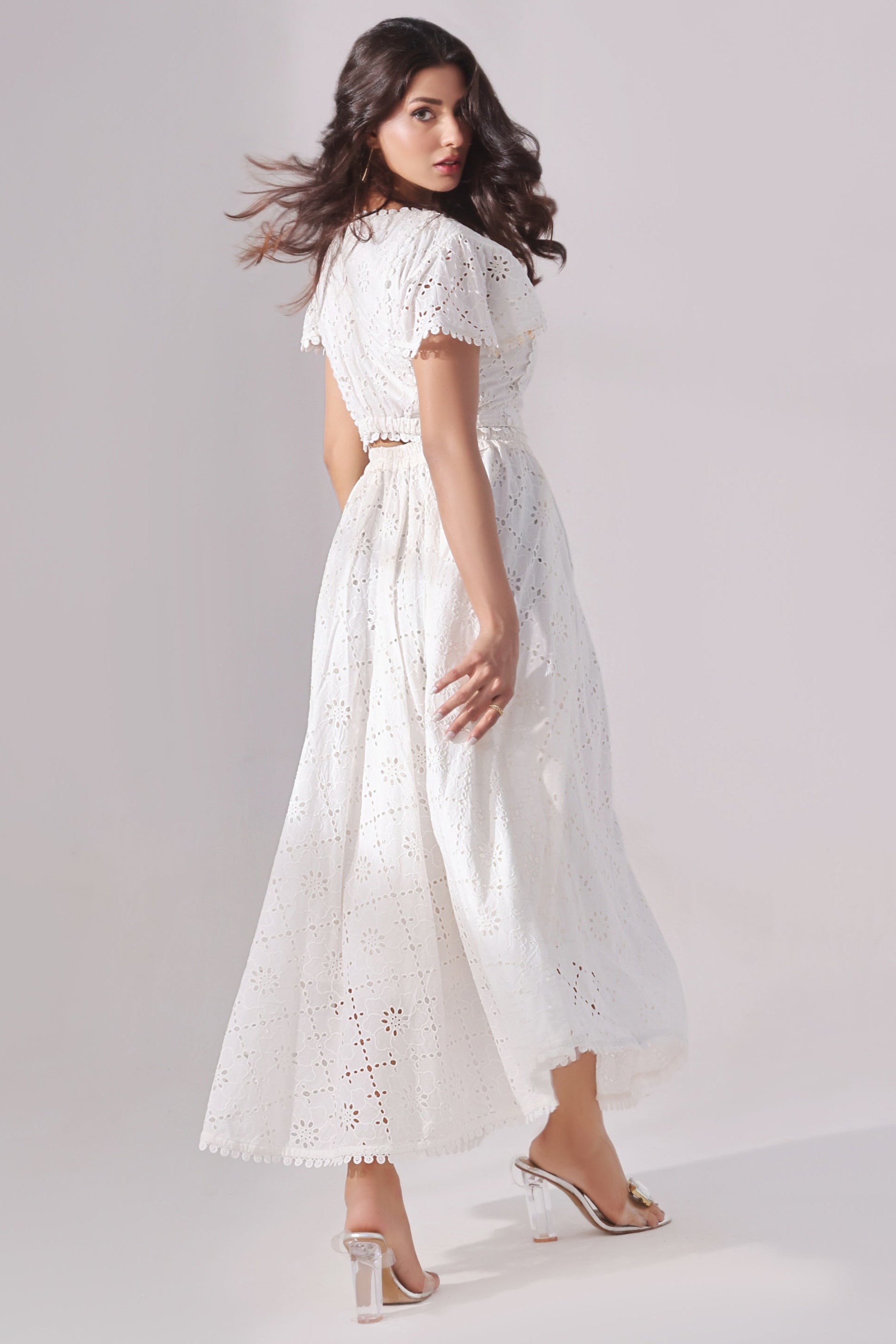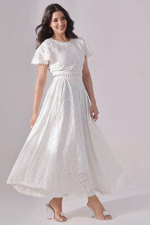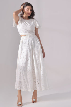 Step into timeless elegance with this white Schiffli co-ord set featuring a romantic frill top paired with a gracefully flared skirt. The top is crafted from delicate Schiffli-embroidered cotton, known for its airy texture and intricate eyelet patterns. Feminine frill details at the neckline, sleeves, or hem add soft volume and charm.