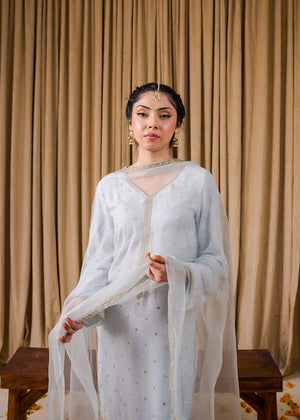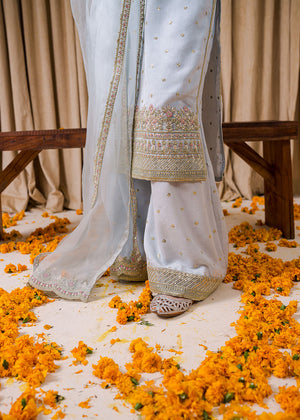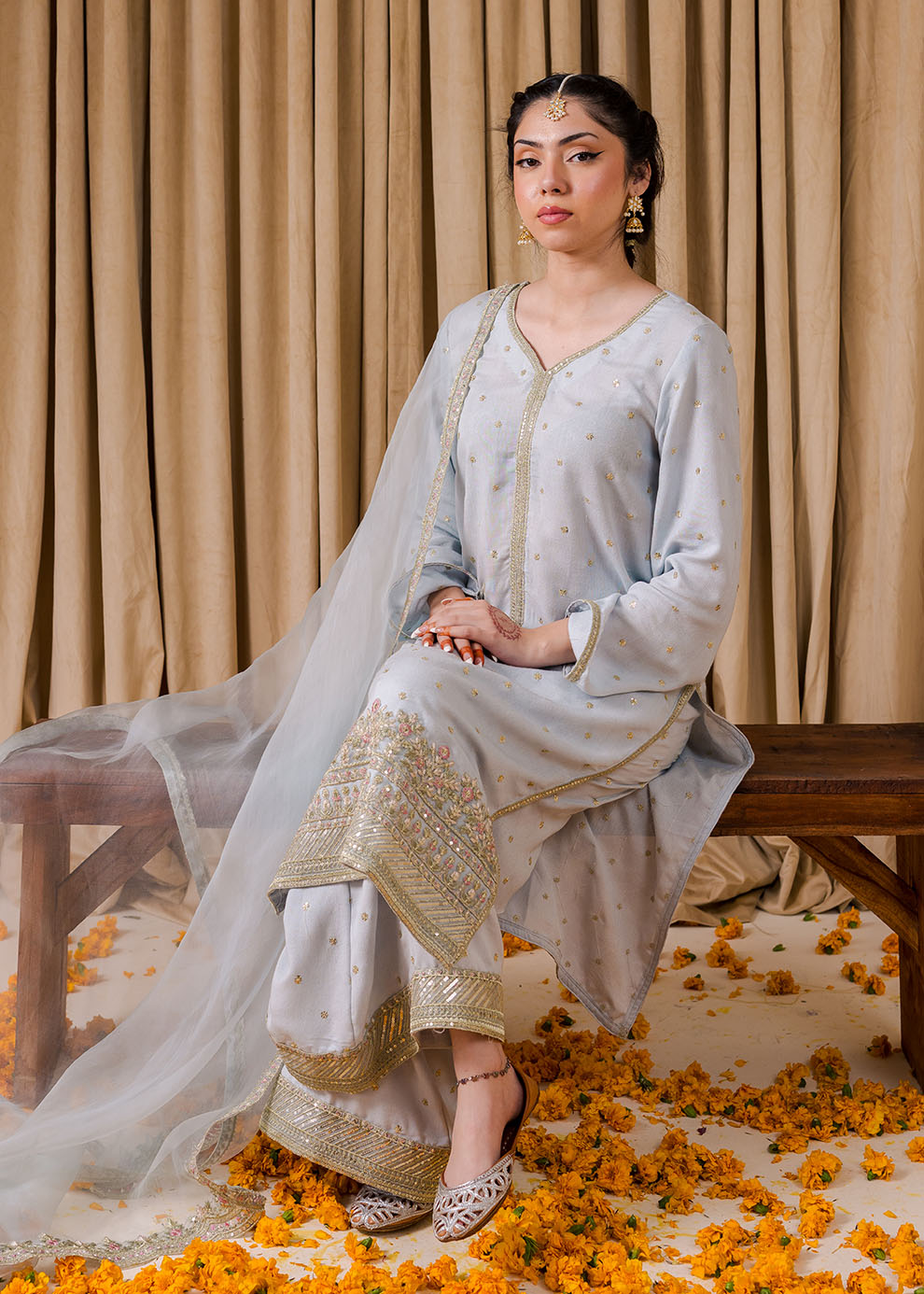 A long, straight powder blue shirt adorned with dull golden sitara and tilla embroidery, featuring intricate floral detailing. Paired with embroidered culottes and a sheer organza dupatta with scalloped edges for an elegant finish.