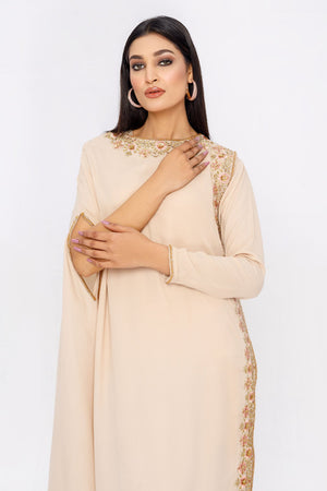 This attire is an interesting twist to the traditional kaftan. Detailed with embroidery and baadla work, Handwork added to make you stand out. embellished with pearls lace finishing on the side. An absolutely stunning choice for your luxury wardrobe.