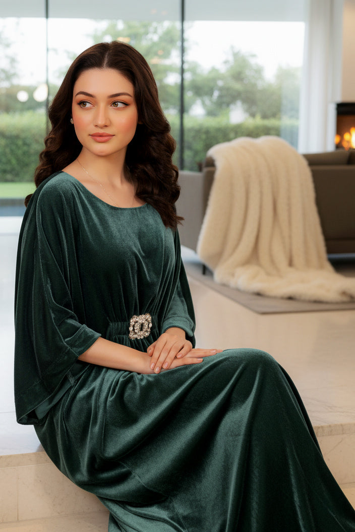 Blending regal charm with winter warmth, VELORIA embodies the essence of timeless sophistication. Each kaftan crafted from premium imported velvet - flows with graceful ease, offering an elegant silhouette that combines modern refinement with traditional modesty. The smooth velvet texture, radiant sheen, and crystal-embellished brooches bring understated glamour to every movement.