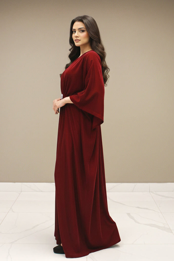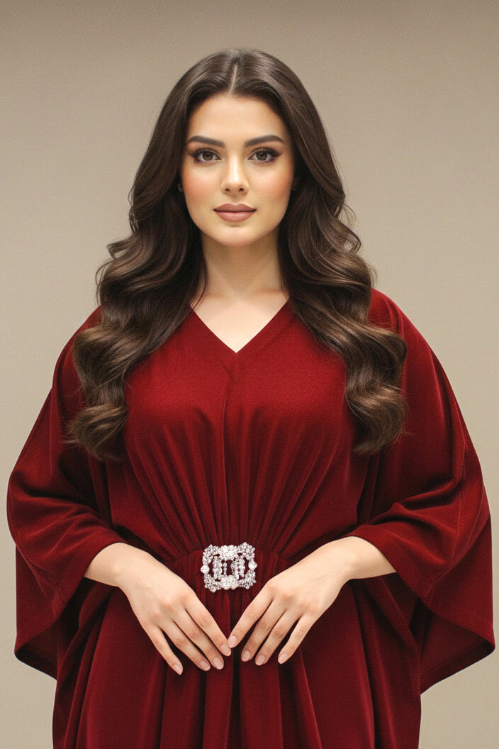 Blending regal charm with winter warmth, VELORIA embodies the essence of timeless sophistication. Each kaftan crafted from premium imported velvet - flows with graceful ease, offering an elegant silhouette that combines modern refinement with traditional modesty. The smooth velvet texture, radiant sheen, and crystal-embellished brooches bring understated glamour to every movement.