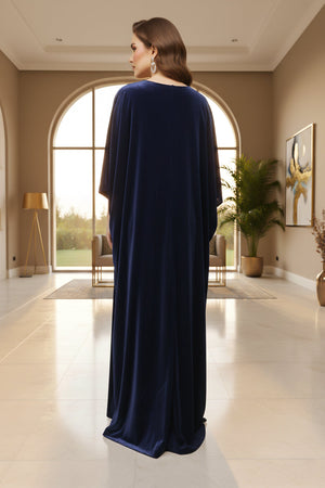 Blending regal charm with winter warmth, VELORIA embodies the essence of timeless sophistication. Each kaftan crafted from premium imported velvet - flows with graceful ease, offering an elegant silhouette that combines modern refinement with traditional modesty. The smooth velvet texture, radiant sheen, and crystal-embellished brooches bring understated glamour to every movement.