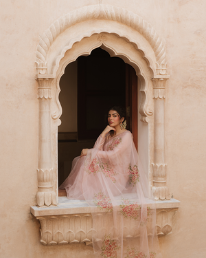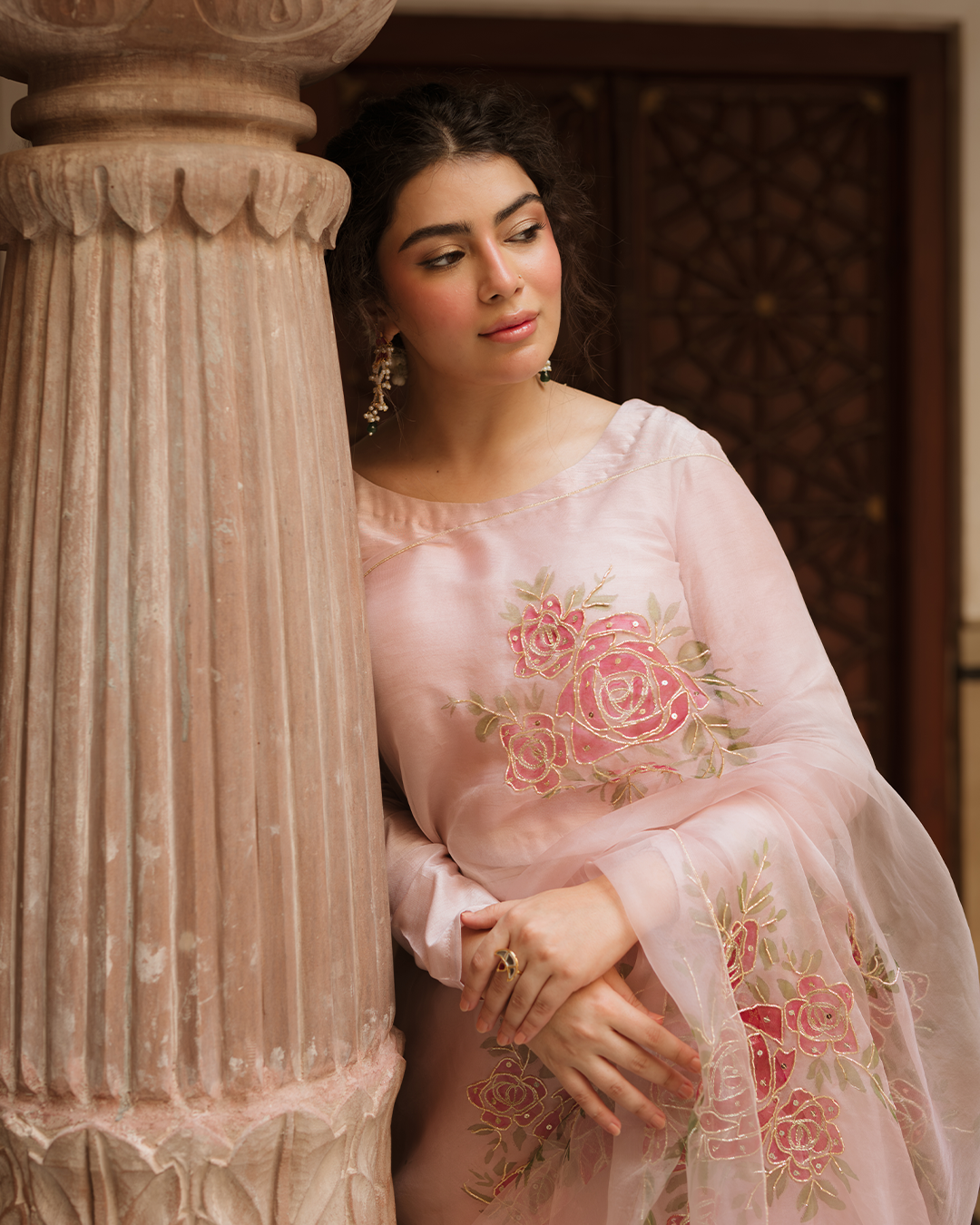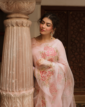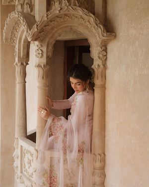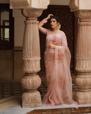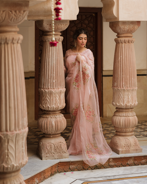 Meet ‘Wafa’—a Tea Pink dream rendered in luxurious Organza. This hand- painted saree glistens with intricate sitara, tilla, and zari embellishments, creating a captivating interplay of light and texture. The delicate hues and meticulous detailing come together to embody a vision of grace and timeless elegance, making ‘Wafa’ a truly enchanting choice for any special occasion.