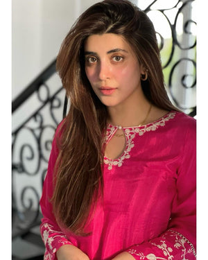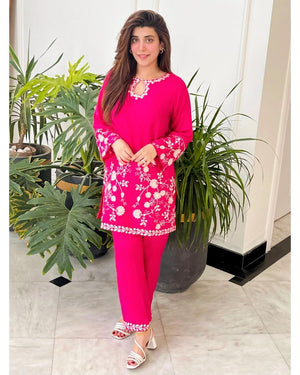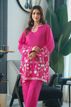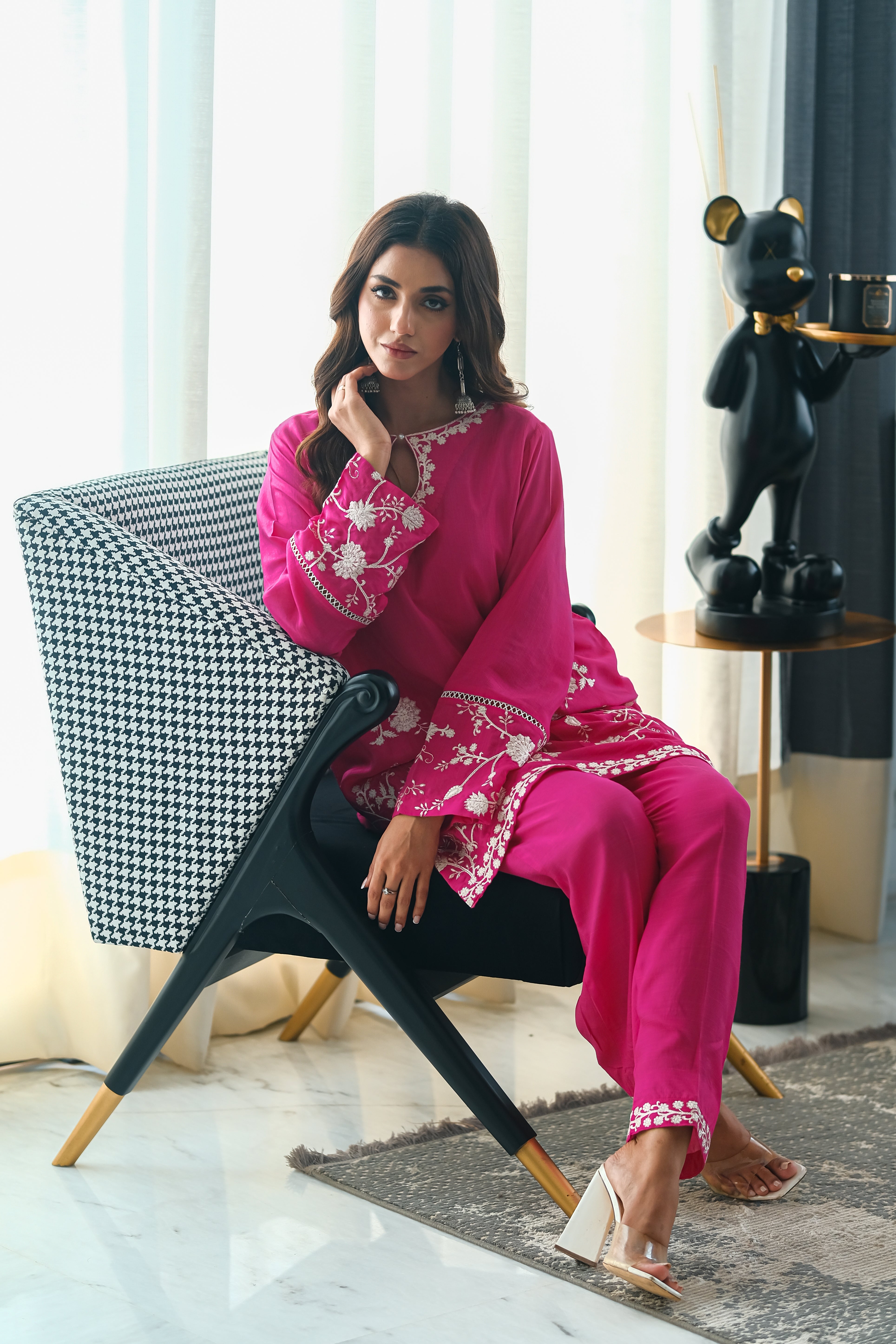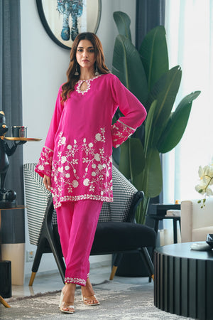 Step into the spotlight with the "Radiant Elegance Set," a stunning two-piece ensemble designed for the modern woman who loves to make a bold yet sophisticated statement. This exquisite hot pink dress, crafted from luxurious raw silk, features intricate white embroidery that adds a touch of timeless elegance. The top boasts a flattering fitted silhouette with delicate floral patterns, while the flowing skirt offers graceful movement and charm. Perfect for special occasions or upscale events, the Radiant Elegance Set embodies a perfect blend of vibrant color and refined craftsmanship, ensuring you stand out with poise and confidence.
