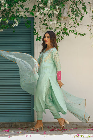 Step into elegance with our?Aqua Grace Embroidered Ensemble, a beautifully crafted 3-piece dress that effortlessly blends traditional charm with modern sophistication. This stunning outfit features a soft aqua-toned kurta adorned with intricate embroidery, exuding a timeless appeal. The delicate embellishments on the sleeves and neckline add a touch of luxury, while the contrasting pink accents provide a subtle pop of color.