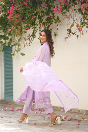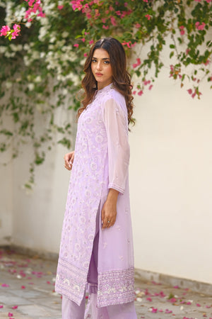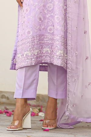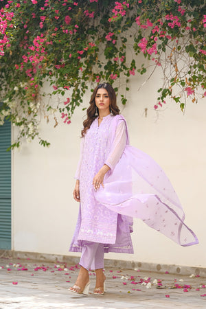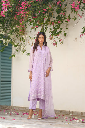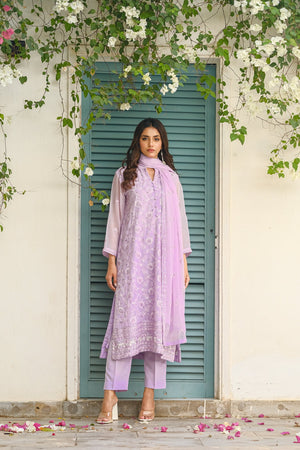 Indulge in the ethereal beauty of the "Lavender Dream" - a mesmerizing 3-piece luxury chiffon ensemble that embodies grace and sophistication. Crafted from the finest chiffon fabric in a delicate lilac hue, each piece of this ensemble is meticulously embroidered with intricate patterns, reminiscent of delicate lavender blossoms swaying in a tranquil breeze.