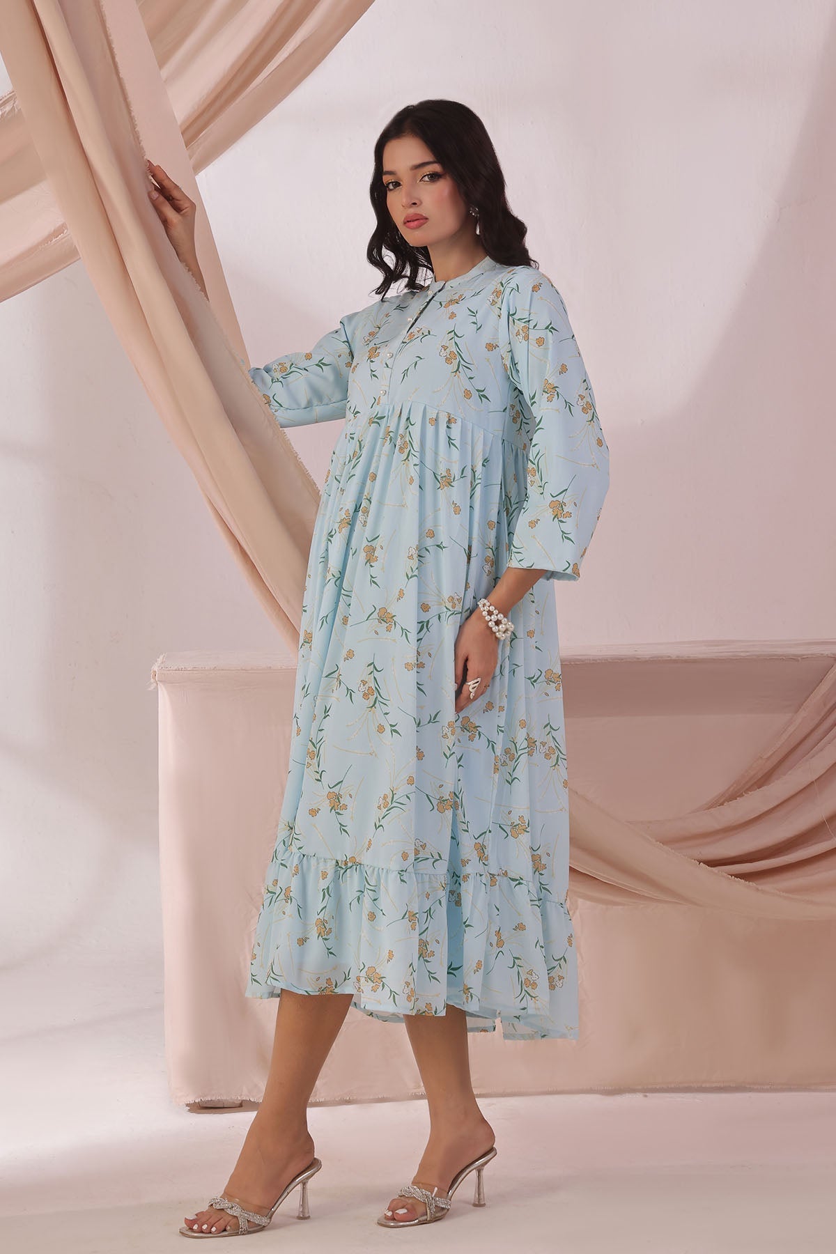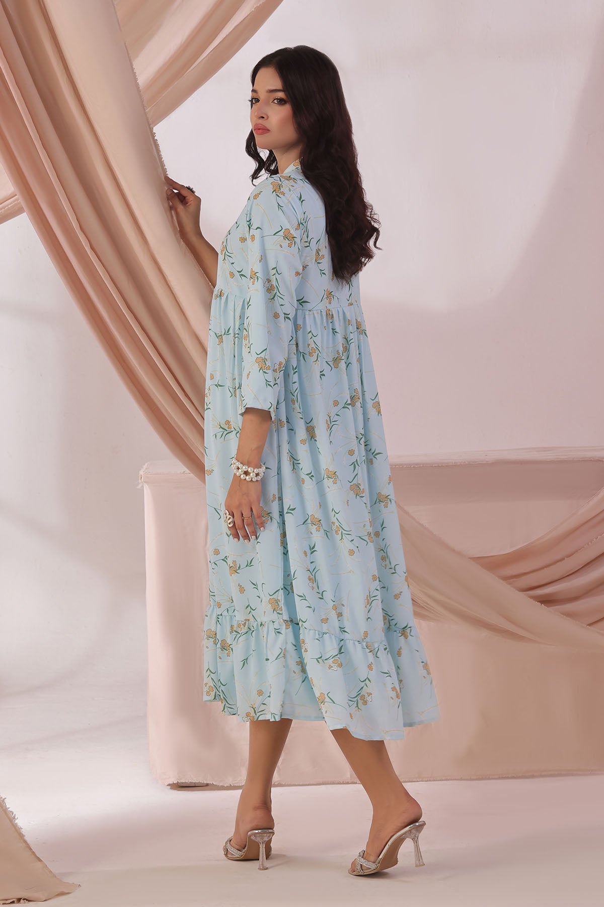 Top: Sky Blue Printed Chiffon Long Dress With Malai Crepe Lining