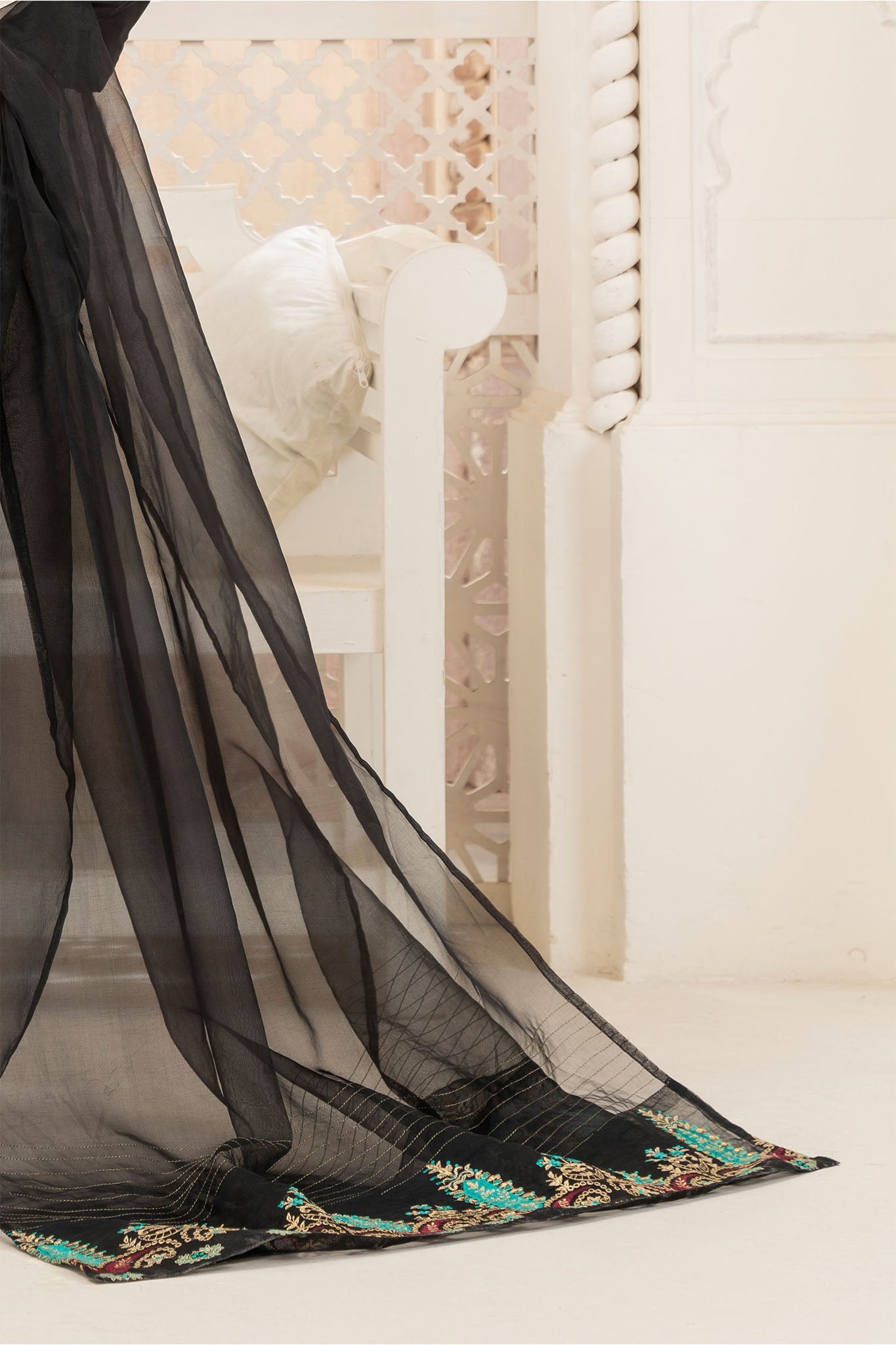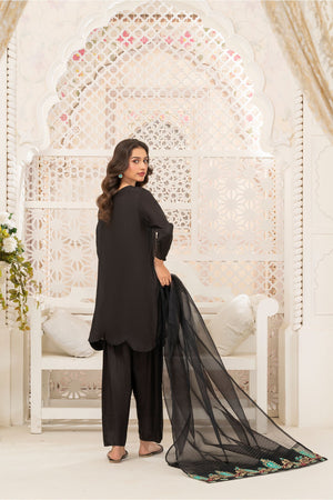 Additional Description: Timeless Elegance – Black raw silk 3-piece featuring fabric buttons on the neck and sleeves, big scalloped daman, a classic Farsi shalwar, and an embroidered organza dupatta for a look of pure sophistication.