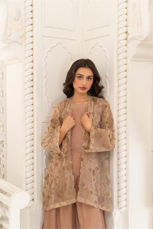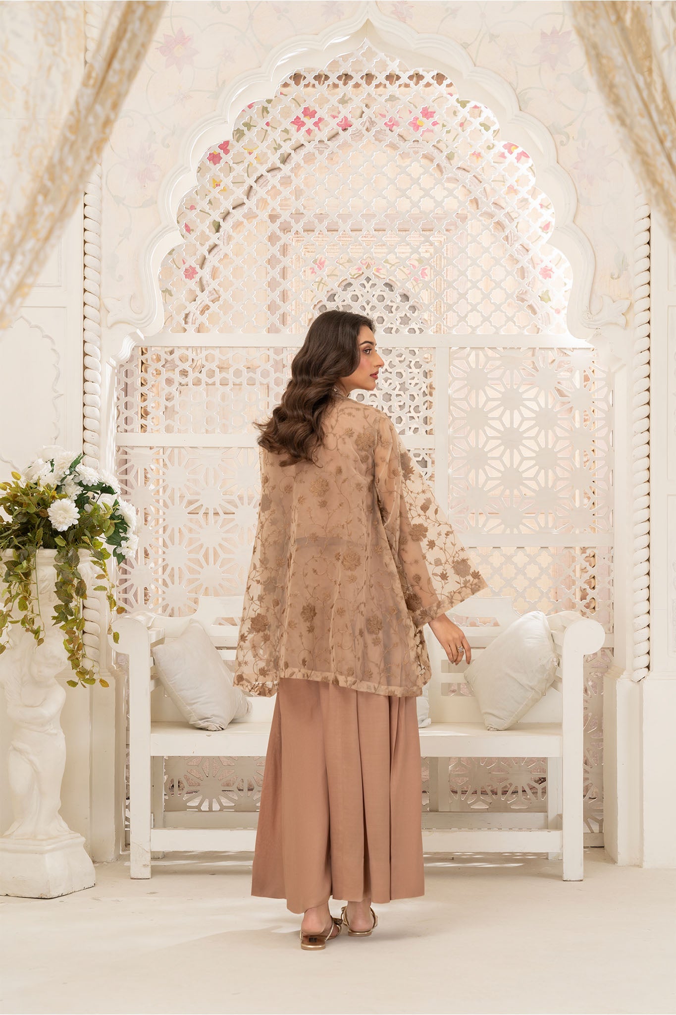 Additional Description: Elegant organza embroidered gown with intricate handwork lace, featuring a sleeveless inner and a high-waisted pleated pant with a graceful flare—timeless beauty redefined!