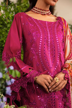 A stunning dark raspberry-hued dress exudes sophistication with its rich and deep tone, perfect for making a bold statement. The luxurious lawn fabric enhances its elegance, while fine embroidery adds a touch of intricate detailing. Paired with straight pants and eye-catching dupatta. This dress is ideal for evening events.