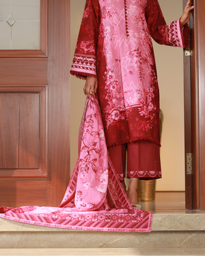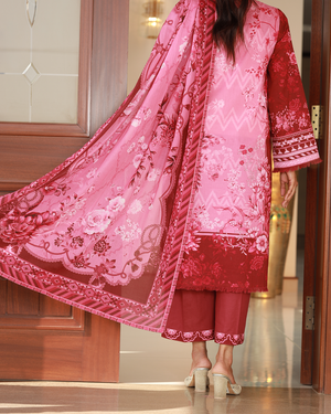 Embrace timeless femininity with this breathtaking unstitched lawn ensemble in beautiful shades of pink and rose. This stunning three-piece suit features captivating ombré-style floral prints and elegant border detailing that create a sophisticated and romantic aesthetic, perfect for special occasions.
