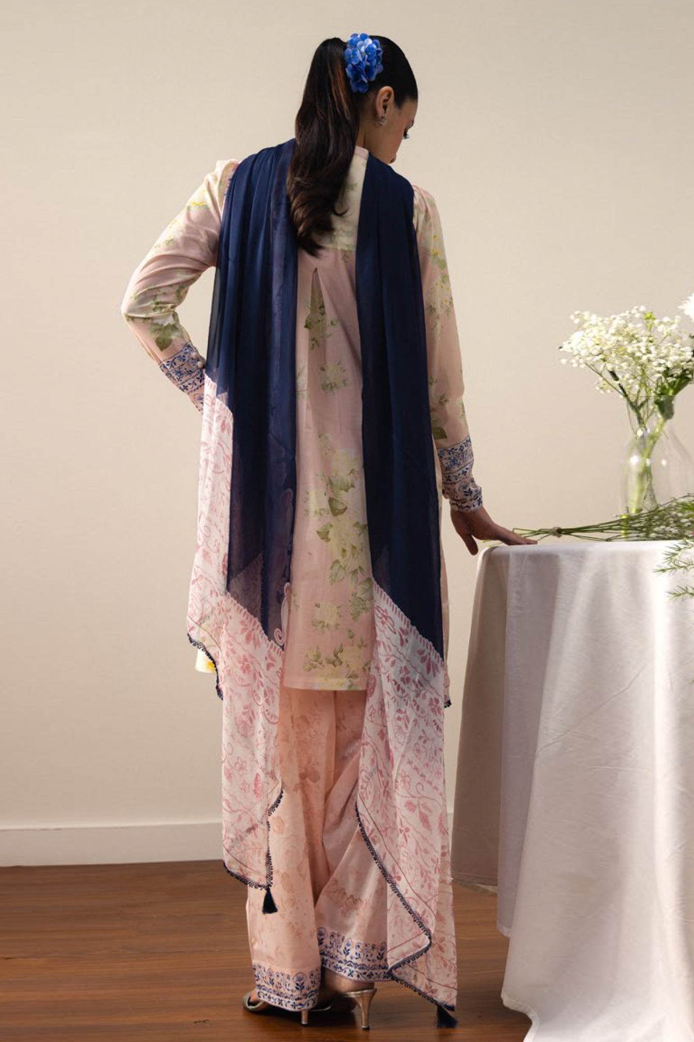 A soft, vintage-inspired composition featuring delicate florals scattered across an airy blush and ivory base. The elongated central motif adds quiet structure, while the navy chiffon dupatta—framed with pale pink borders—introduces depth to this otherwise light, romantic ensemble.