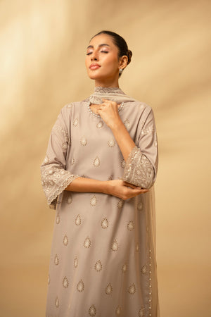 Experience timeless elegance with the Frosted Silver 3-piece Chicken Kari Lawn Suit. Crafted for comfort and style, this suit blends intricate embroidery with lightweight lawn fabric, perfect for warm days. Its sophisticated design enhances your look effortlessly, making it ideal for both casual gatherings and special occasions. Enjoy breathable fabric paired with detailed craftsmanship for a graceful and confident appearance.