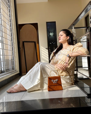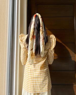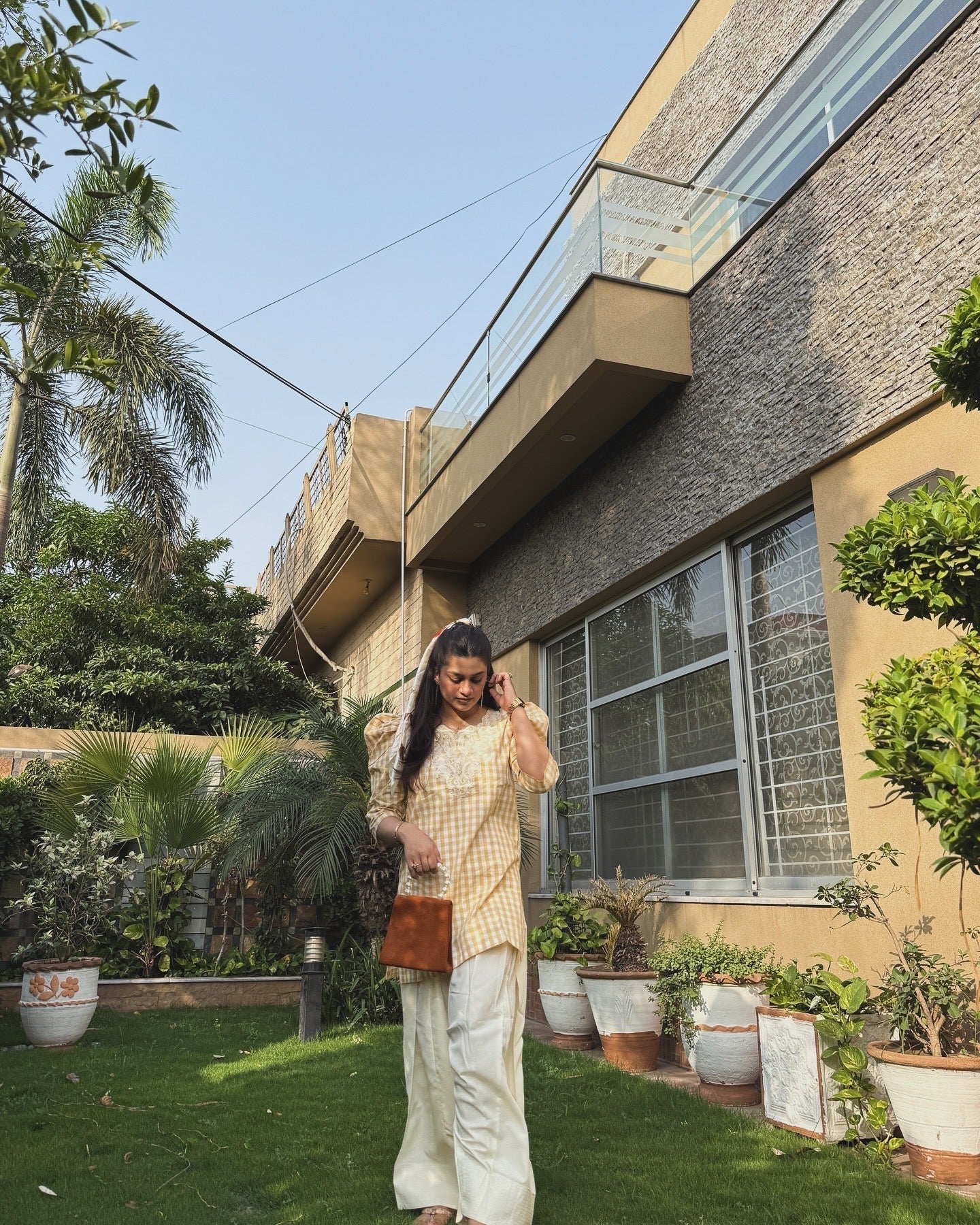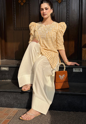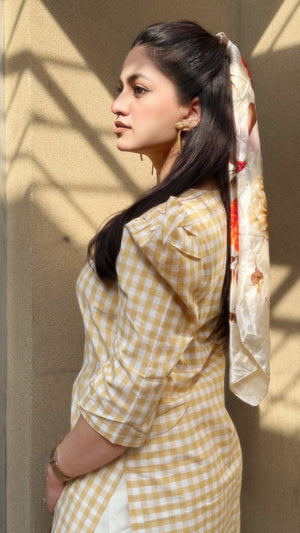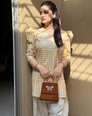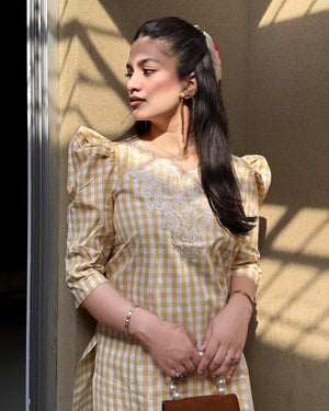 The radiant debut of our Spring/Summer ’25 collection. A blend of abstract check prints, beautifully customised embroidered neck with puff sleeves  and our classic farshi shalwar cut. Elevate your wardrobe this spring with this elegantly crafted, exquisite piece.