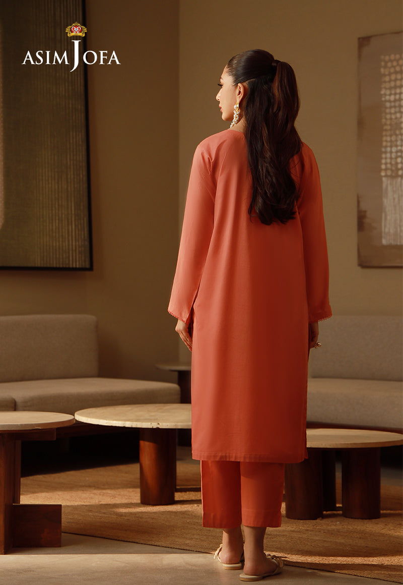 This captivating dark salmon ensemble radiates a warm, inviting charm. The shirt, bathed in a rich, sunset-inspired hue, is graced with a flourish of gorgeous floral embroidery, cascading across the neckline and sleeves, adding a touch of refined artistry. The simplicity of the accompanying plain trousers allows the intricate embroidery to truly blossom, creating a look effortlessly graceful.